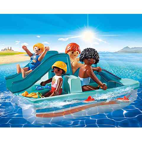 A vízparti nyaralás elmaradhatatlan kelléke a vízibicikli, melyet most a gyerekek a Playmobil játék során is használatba vehetnek. A kis járműre természetesen a nyaralók is felültethetők, akiknek lábára papucsot is adhatnak a kicsik. A vízibicikli csúszdával is felszerelt, így a mélyebb vízbe érve akár le is csúszhatnak a Playmobil figurák egy izgalmas vízbe érkezéssel színesítve az élményt. A kiegészítő játékszett remekül használható a szerepjáték során.