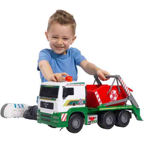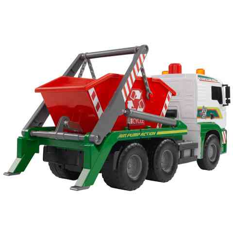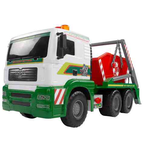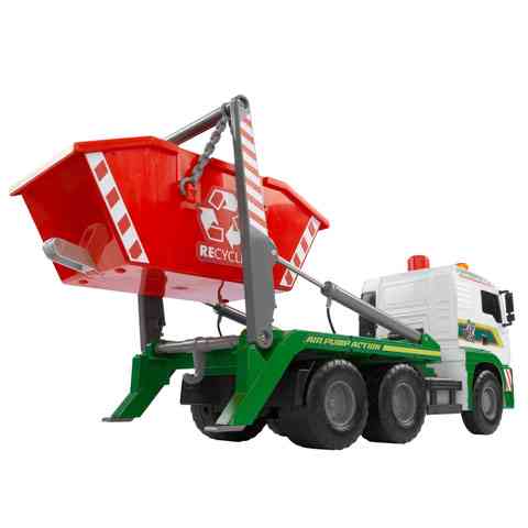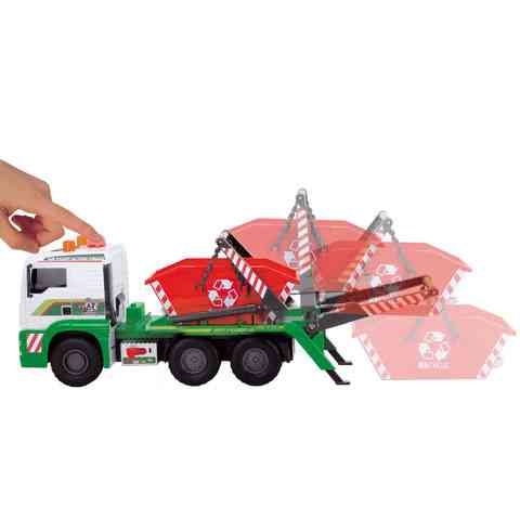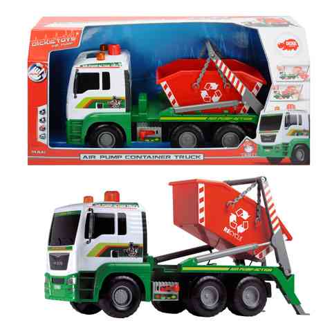 Ha egy igazán elegáns módját szeretnéd választani a szobádban felgyülemlett játékok elszállításának, ez a konténerszállító teherautó igazán pompás választás lehet a számodra! Az autó különleges tulajdonságai közé tartozik a felpumpálható pneumatikus munkahengerrel mozgatható konténer tartály, valamint a kihúzható kitámasztó bakok. Csak állítsd a váltókapcsolót le vagy fel állásba, és a tetején található pumpa segítségével a konténer mozgathatóvá válik. A kereki szabadon futnak, így kézzel könnyedén tologatható akár a szőnyegen is.