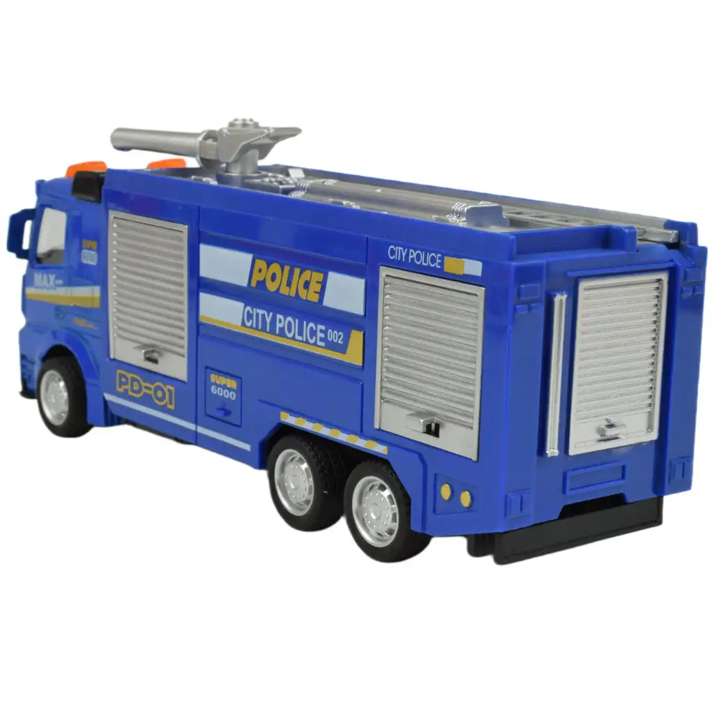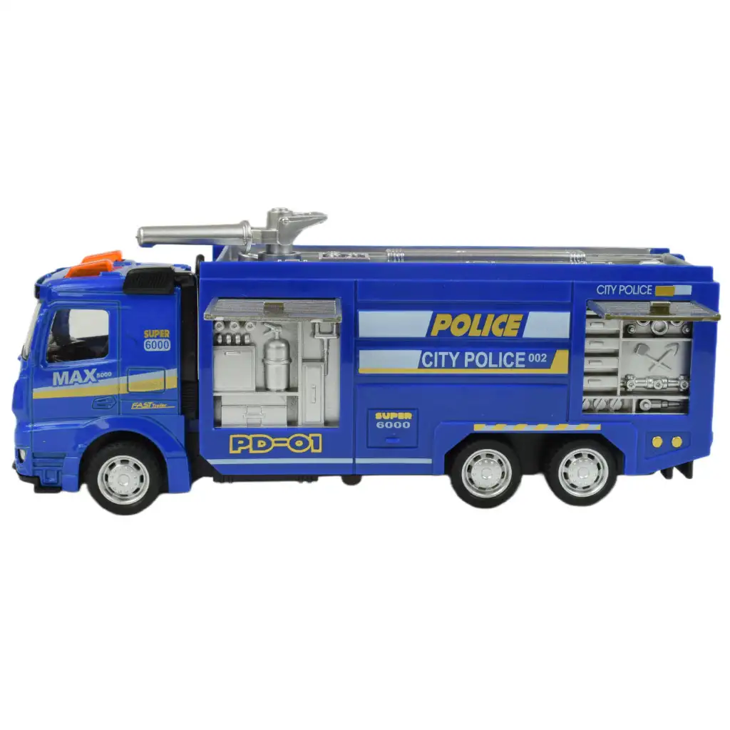 A rendőrség flottája nem csupán járőrautókból és motorokból áll, hanem olyan különleges helyzetekre specializált teherautókból is, amelyekre csak ritkán akad példa. Most lehetőség nyílik arra, hogy a kis srácok autógyűjteménye ezekkel a különleges járművekkel is gazdagodjon, hiszen három különböző változat közül választhatnak. Ezek a több mint tizenöt centiméteres kisautók lenyűgöző részletgazdagsággal készültek, amit a jól felismerhető rendőrségi festés tovább fokoz, ráadásul a beépített fény- és hanghatások még izgalmasabbá teszik a gyerekek játékát és élményét.