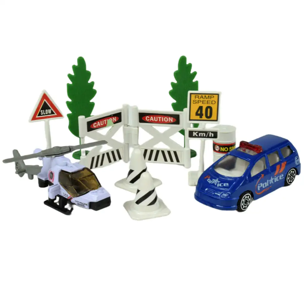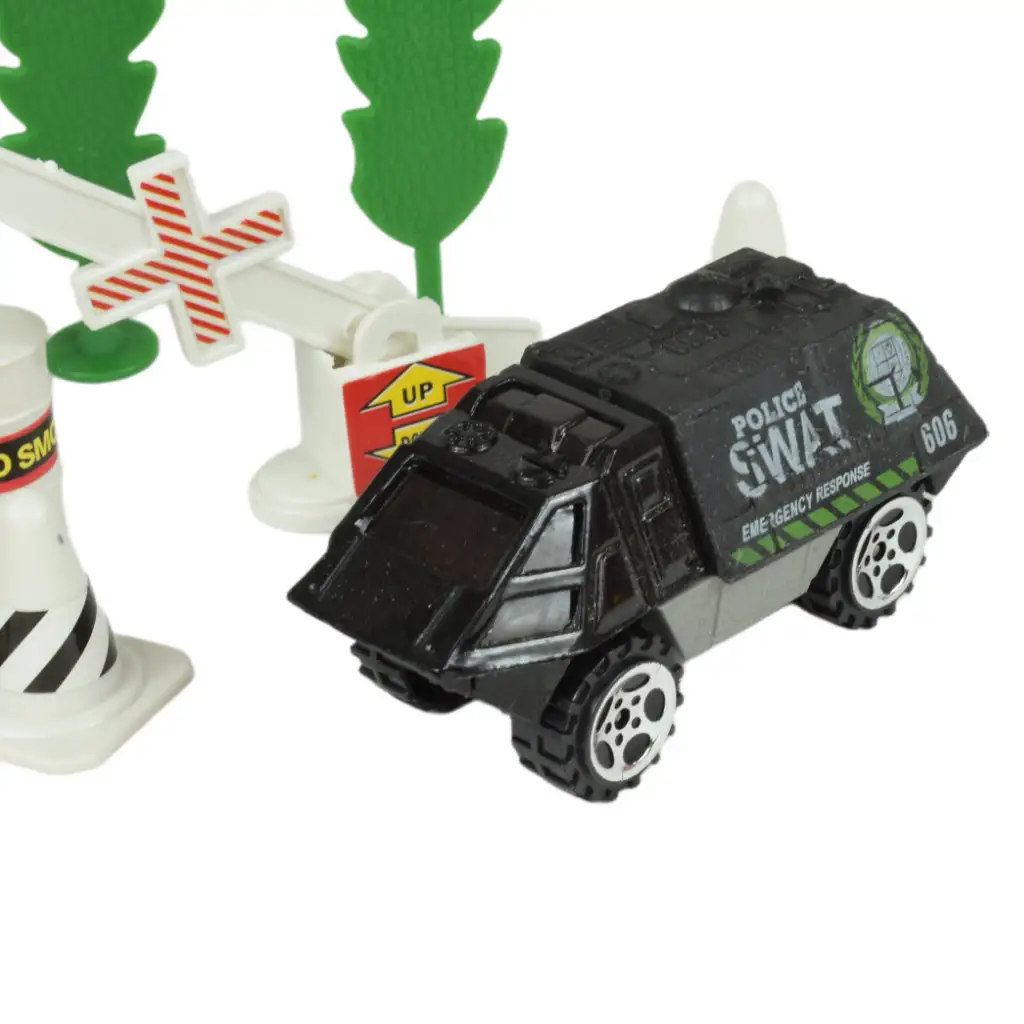 A rendőrök nap mint nap kivételesen fontos munkát végeznek, miközben az utcákon villogó fényekkel és szirénázó autókkal közlekednek. Ha kisfiad nagy rajongója ennek a hősi hivatásnak, akkor ez a rendőrautó szett egy fantasztikus választás lehet neki. Ez a szett többféle rendőrautót tartalmaz, mindegyikük más és más jellegzetességekkel és kiegészítőkkel rendelkezik, amelyek a játék élményét még izgalmasabbá teszik. A kiegészítők között megtalálhatók fák, közlekedési táblák, bóják, valamint lezárt területeket jelző kerítések is, amelyek a gyermeked képzeletét és kreativitását csak tovább serkentik.