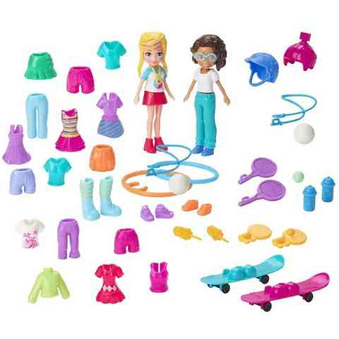 Polly Pocket kedvenc időtöltései közé tartozik a gördeszkázás és görkorizás és ebben az összesen 32db különböző ruhadarabot és kiegészítőt tartalmazó szettben gyermeked minden olyan eszközt megtalálhat, amelyekkel Polly-t a szabadidős elfoglaltságokhoz divatosan felöltöztetheti. A ruha és kiegészítő darabok kompatibilisek bármely más Polly Pocket figurával, de a szettben található két karaktert is könnyedén felöltöztetheti gyermeked a játék során.