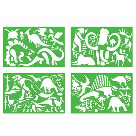 A dinoszauruszok izgalmas világa tárul most eléd. Ezzel a nagyszerű műanyag rajzoló készletnek a segítségével játszi könnyedséggel elevenítheted meg a már kihalt állatkákat. 4 darab előre elkészített műanyag stencil áll rendelkezésedre a véget nem érő alkotáshoz. Csak helyezd a papírlap fölé és másold át a mintát. Bátran kombináld a különböző dinoszauruszokat és készíts egy lenyűgöző rajzot. A sablonok nedves ronggyal tisztíthatóak.