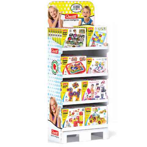 Ez a nagy álló karton display remek lehetőséget kínál arra, hogy a bolt által forgalmazott Quercetti termékek kellőképp nagy hangsúlyt kapjanak, és könnyen megtalálhatók legyenek, ezzel is fókuszálva a vásárolók figyelmét a termékcsaládra. A display kemény kartonból készül, mely kellően ellenálló és stabilan tartja meg a ráhelyezett termékeket. Az élénk dekoráció vonzza a tekinteteket és remekül felhívja magára a figyelmet. Az megadott ár kizárólag az üres display-re értendő, amelyet igény szerint a Quercetti termékcsalád bármely tagjaival fel lehet tölteni.