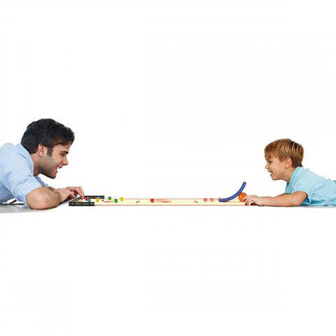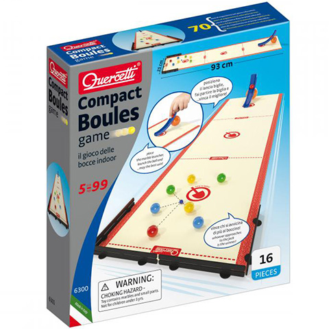 A Quercetti Compact Boules golyójáték egy roppant izgalmas verseny és ügyességi játék amely akár hordozható is, amelynek köszönhetően akár egy kirándulás során is magával viheti gyermeked, hogy egy percig sem kelljen unatkoznia. A csomagban található 93cm-es Roll-Up szőnyeget kitekerve nincs más dolgod, mint a végére helyezni a négy darab falat amely akadályként szolgál a játékban, majd felhelyezni a játéktérre a márványgolyókat.