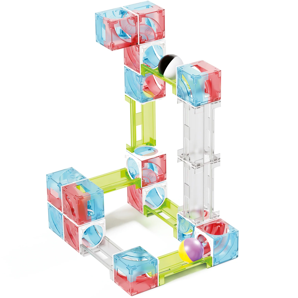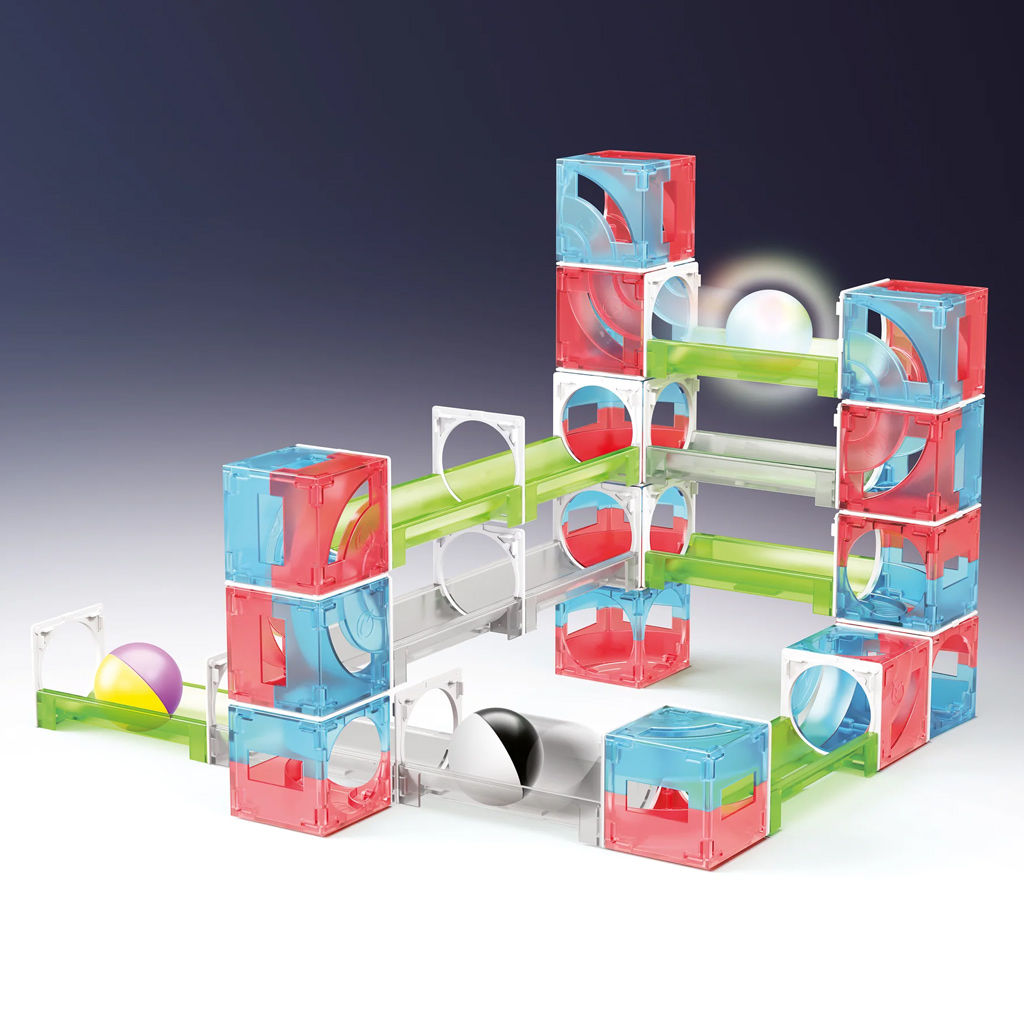 A szett tartalmaz egy világító golyót is, ami mozgás közben automatikusan felvillan, így a játék esti fényben is lenyűgöző látványt nyújt. A golyók különböző színűek és mintájúak, így vizuálisan is izgalmas élményt kínálnak. A minőségi, áttetsző műanyag elemek stabilan illeszkednek egymásba, a színes kockák pedig könnyen összerakhatók és szétszedhetők, még a kisebb kezek számára is.