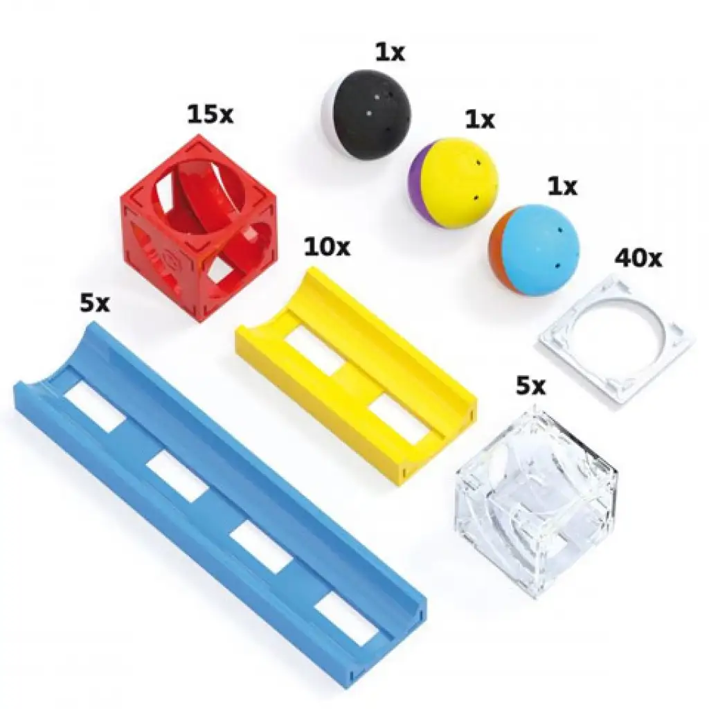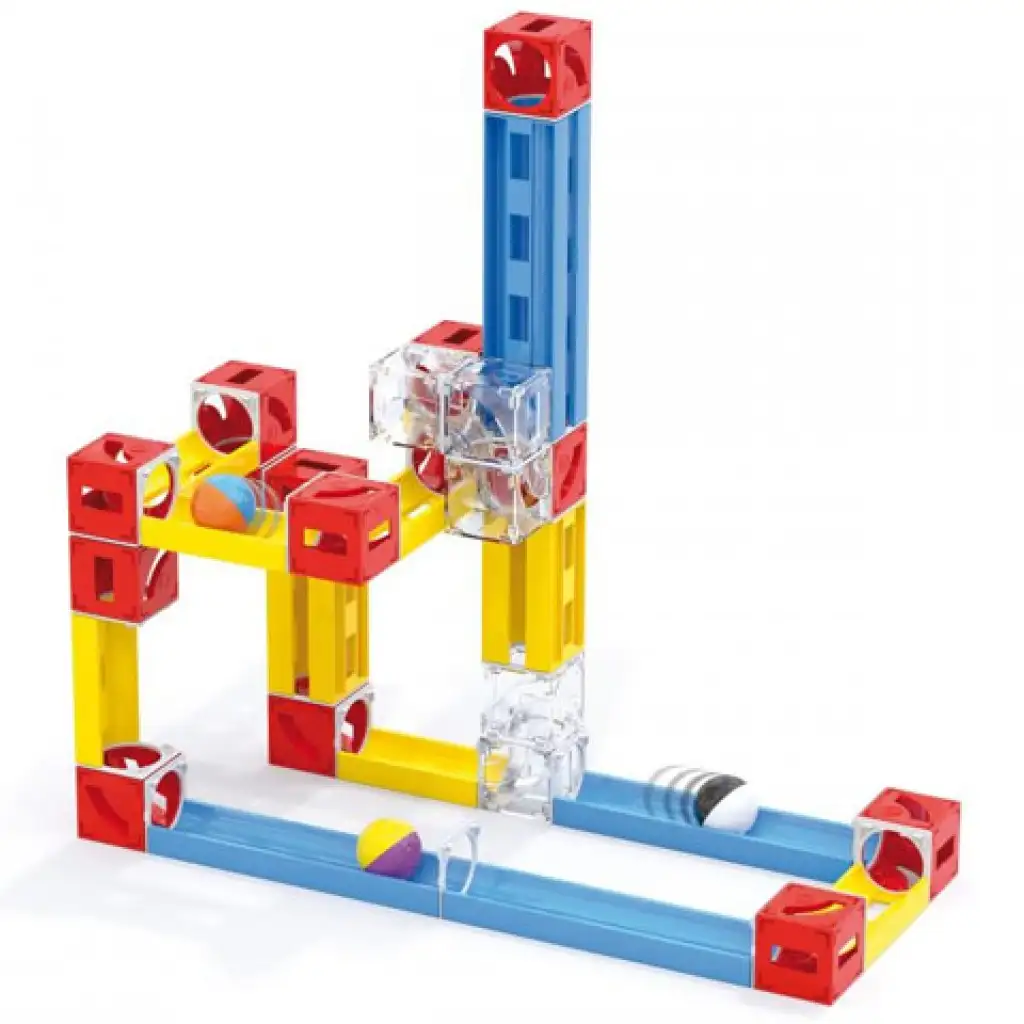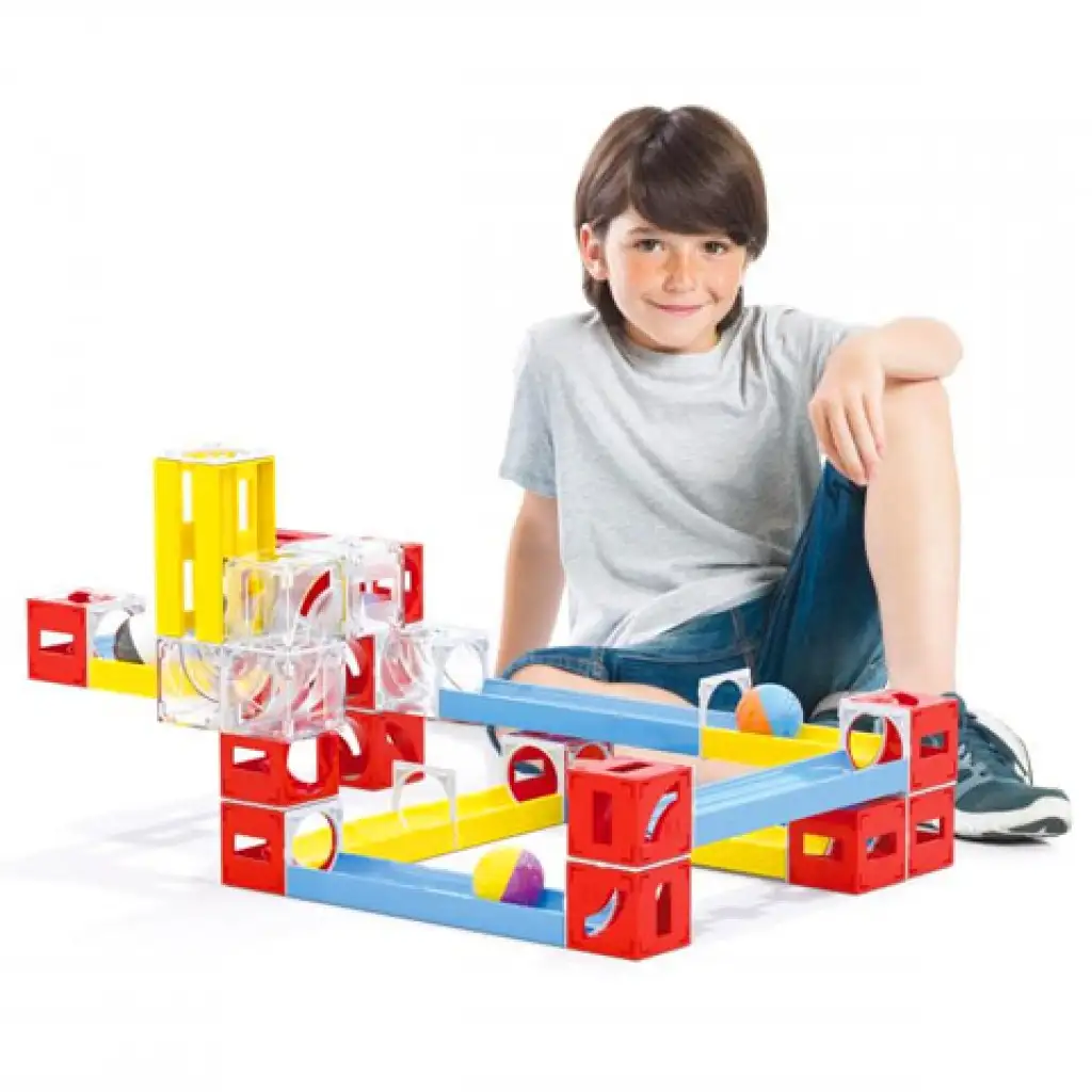 Színes és egyben látványos golyópályát építhetnek maguknak a gyerekek a kreatív játék során, melynek segítségével megismerkedhetnek a gravitáció hatásával és kézügyességüket is fejleszthetik egyszerre. A golyópályát sínpálya elemekből és kockákból építhetik meg a kicsik, melynek végén a színes golyóknak végig kell tudniuk haladni a pálya vonalán. A 78 elemmel érkező Cuboga golyópálya szett nagyszerű kihívás a gyerekek számára!