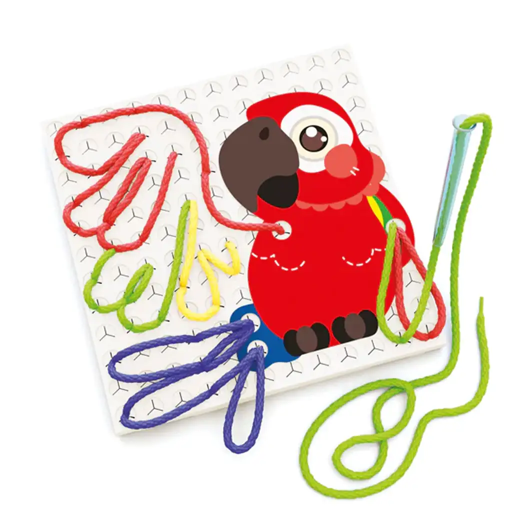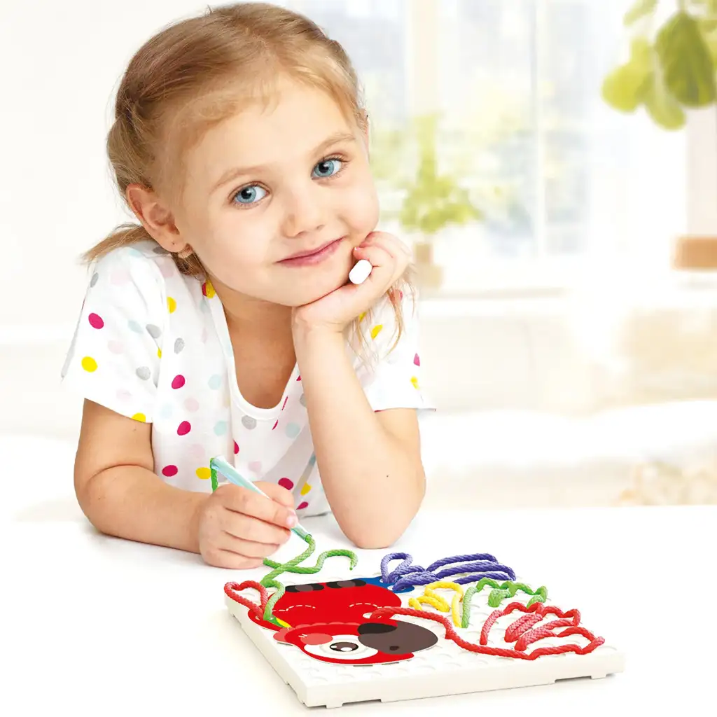 A játék lényege, hogy a sablonokat a lyukakkal ellátott táblára helyezed, majd átfűzöd a fonalakat a sablonok lyukain keresztül, így kirajzolva a sablonokat. Ez a szett állatokkal kapcsolatos mintákat tartalmaz, így megtalálható benne zsiráf, kukac és papagáj is.