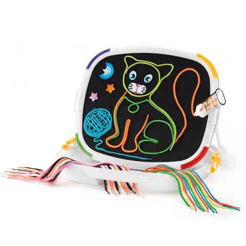 Készítettel már rajzokat különféle színes fonalak segítségével? Ha még nem, akkor itt az ideje, hogy kipróbáld ezt a nagyszerű és szórakoztató játékot. A kétoldalas rajztáblának használhatjuk a fehér avagy a fekete oldalát. A Speciális tollakba a készletben található színes fonalat tudjuk betölteni, és a táblára ezzel a fonállal készíthetünk különféle rajzokat. használhatjuk a mellékelt sablonokat is, de ha már elég ügyesek vagyunk készíthetünk saját mintákat is. A játék a kreativitáson kívül rendkívüli mértékben fejleszti a kézügyességet.