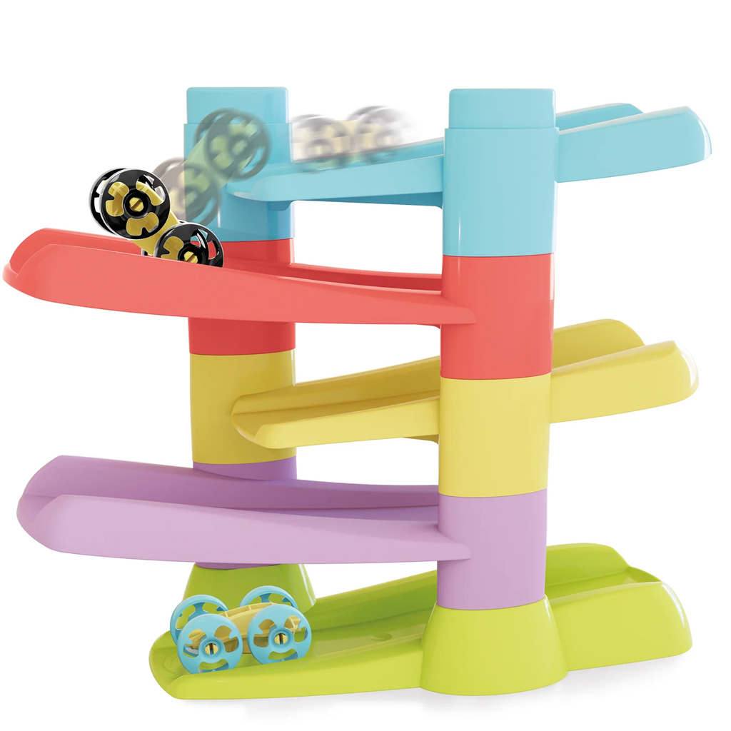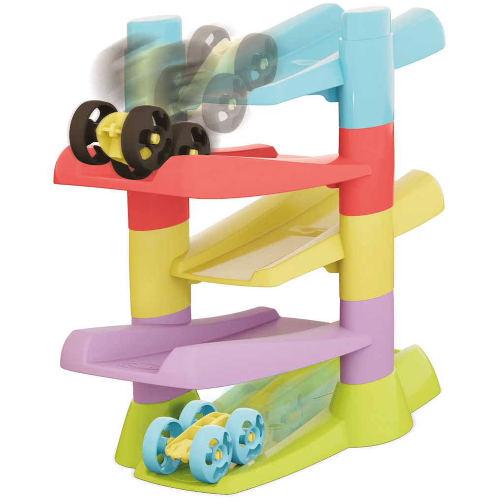 A torony 5 szinten keresztül vezeti végig a kis flip autókat, amelyek minden lejtő végén automatikusan átfordulnak és folytatják száguldásukat lefelé. Ez a „flip” mozgás nemcsak látványos, hanem segít a gyerekeknek megérteni az ok-okozati összefüggéseket, miközben ösztönzi őket az ismétlésre, kísérletezésre és felfedezésre.