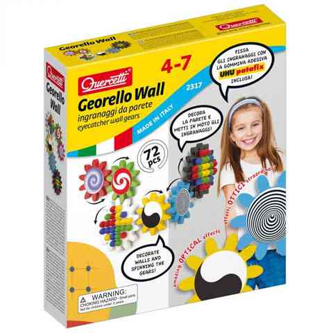 A Georello játékokat aligha kel bemutatni, hiszen a gyerekek imádják a fogaskerekeken és azok kapcsolódásán alapuló építős játékokat. Nem is meglepő, hiszen még a felnőttek is szeretettel nézik, ahogy az összekapcsolódó fogaskerekek egymást hajtják előre, és a Quercetti ezt tovább fokozza, hogy a fogaskerekek közepére olyan ábrákat illeszt amelyek forgás közben még látványosabbak. Ez a fali szett még különlegesebb, hiszen a fogaskerekeket a függőleges falra tudjuk felragasztani. Akár a sarkon túllógva is képesek a fogaskerekek csatlakozni egymáshoz, így egyszerre lehet nagyszerű játék és színes díszítőeleme a gyerekszobának.