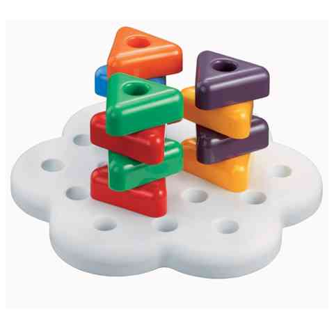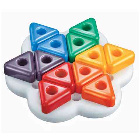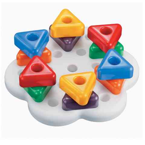 Biztosan minden gyerkőcöt lenyűgöznek a vidám színek és az egymásba építhető elemek. A játékot kifejezetten az ő részükre fejlesztették ki: a háromszög formájú pötyik szélei lekerekítettek, és remek fogást biztosítanak, amiknek köszönhetően könnyen meg tudják fogni és a helyükre tenni a fehér virág formájú táblán. Rajtuk múlik milyen mintában rendezik el a pötyiket, de akár halmozhatják is őket így hozva létre magasabb és magasabb tornyokat. A termék kitűnően fejleszti a kézügyességet, valamint a vizuális készséget.