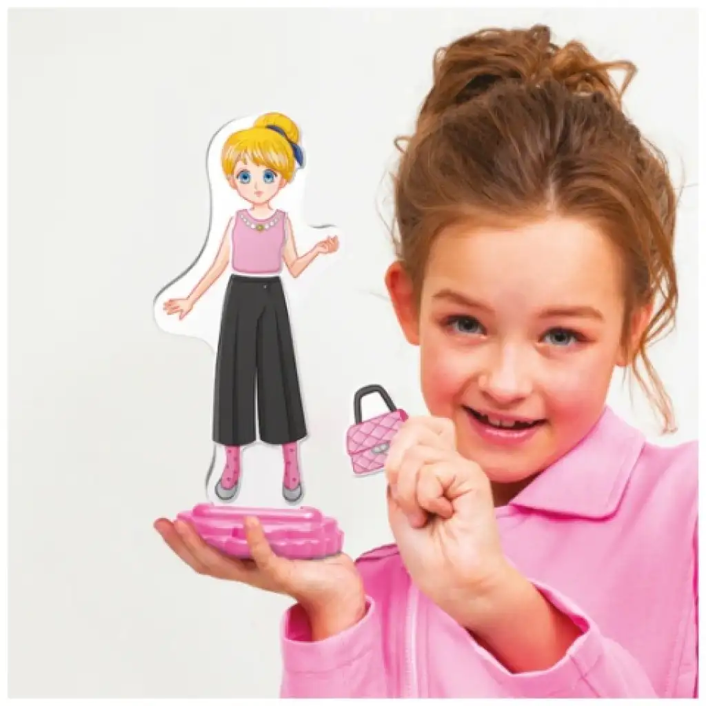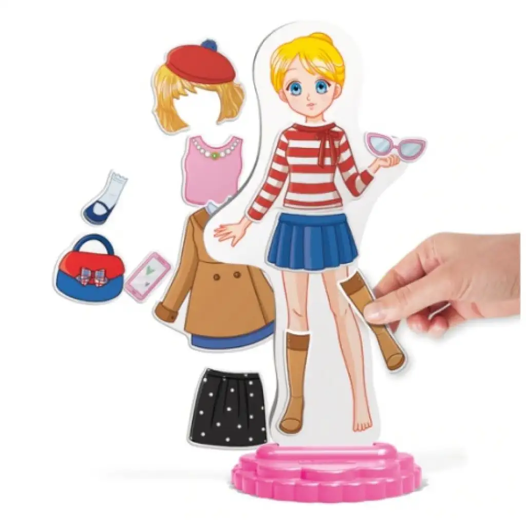 A mindenki által imádott mágnesek most egy igazán elragadó lányos játékban köszönnek vissza. Ebben a öltöztetős készletben minden cipő, ruha, kiegészítő de még a modell: Anna is mágneses, így a ruhák felhelyezése rendkívül egyszerű lesz. Ne késlekedj láss neki minél hamarabb a divatos darabok felpróbálásnak. Anna elhozta az egész ruhatárát, amiben minden alkalomra illő öltözéket megtalálsz. Kombináld bátran őket egymással és érezd magad egy igazi kis divattervezőnek.