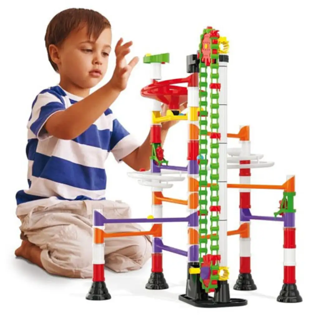 Építs magadnak egy saját szuper golyópályát! Építsd fel a dobozon látható pályavonalat vagy bátran kísérletezz és készíts saját tervezésűt! Csúszdák, egyenes és íves sínek, különböző hidak és oszlopok, tölcsérek ezek mind-mind rendelkezésedre állnak az alkotás során. Ezeknek az elemeknek köszönhetően végtelen variációban készíthetsz merész pályákat az aprócska golyók számára. ha a tervezés során arra is figyelsz, hogy a golyók a lifthez érkezzenek, akkor azzal sem kell vesződnöd, hogy a golyókat újra és újra a pálya tetejére helyezd, hiszen ezt megteszi majd helyetted a lift. A vidám színekben pompázó elemek és az építés öröme garantáltan mosolyt csalnak majd az arcodra, és hosszú órákon át önfeledt kikapcsolást ígérnek.