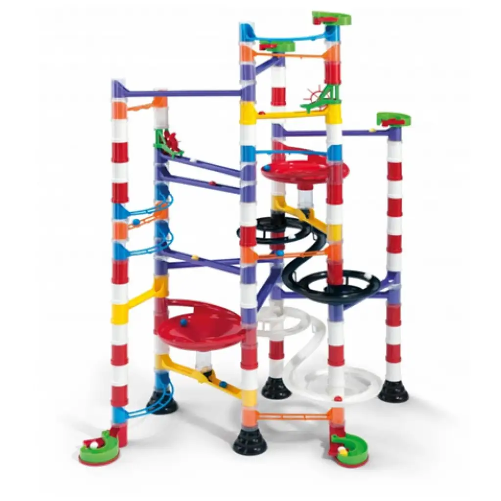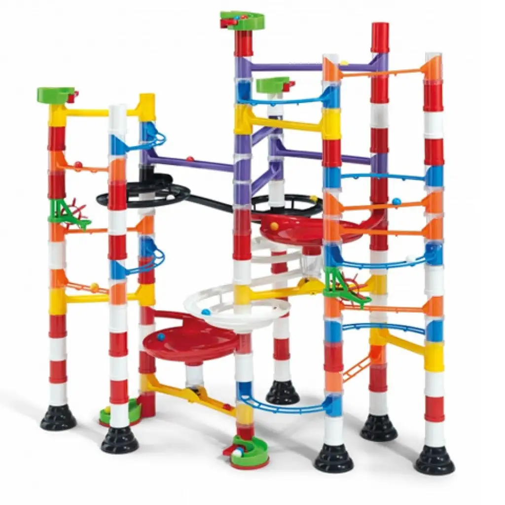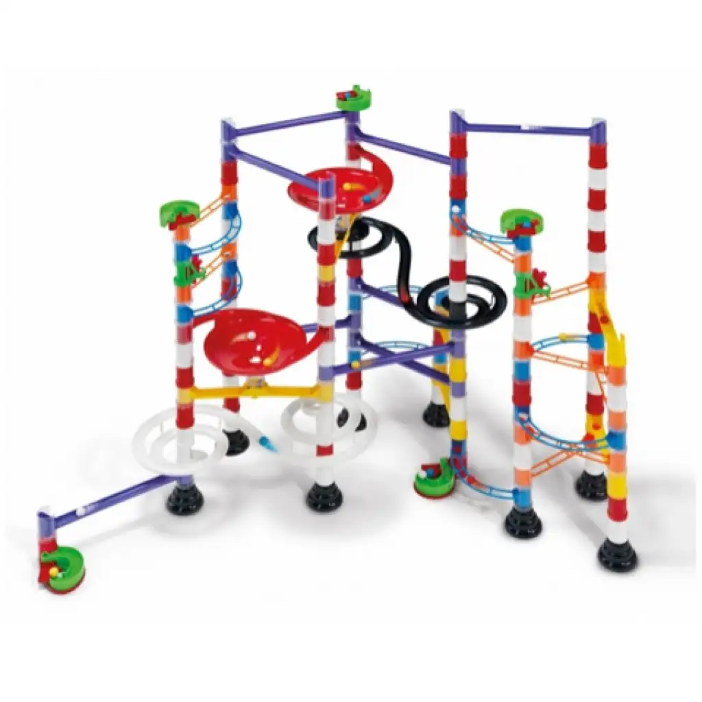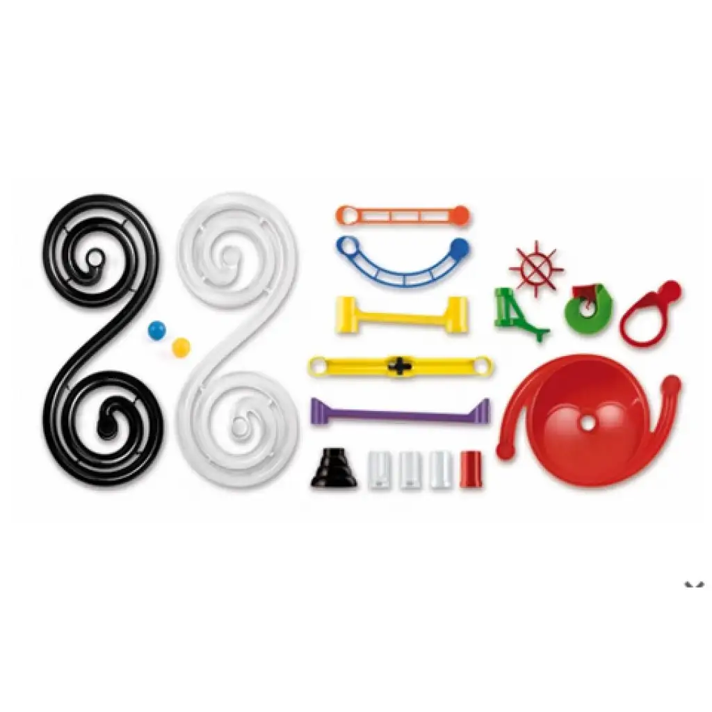 Hozz létre saját izgalmas golyópályát! Építsd fel a dobozon látható szerkezetet vagy bátran kísérletezz és készíts saját tervezésűt! Csúszdák, egyenes és íves sínek, különböző hidak és oszlopok, tölcsérek ezek mind-mind rendelkezésedre állnak az alkotás során. Nekik köszönhetően végtelen variációban készíthetsz merész pályákat az aprócska golyók számára. A vidám színekben pompázó elemek és az építés öröme garantáltan mosolyt csalnak majd az arcodra, és hosszú órákon át önfeledt kikapcsolást ígérnek.