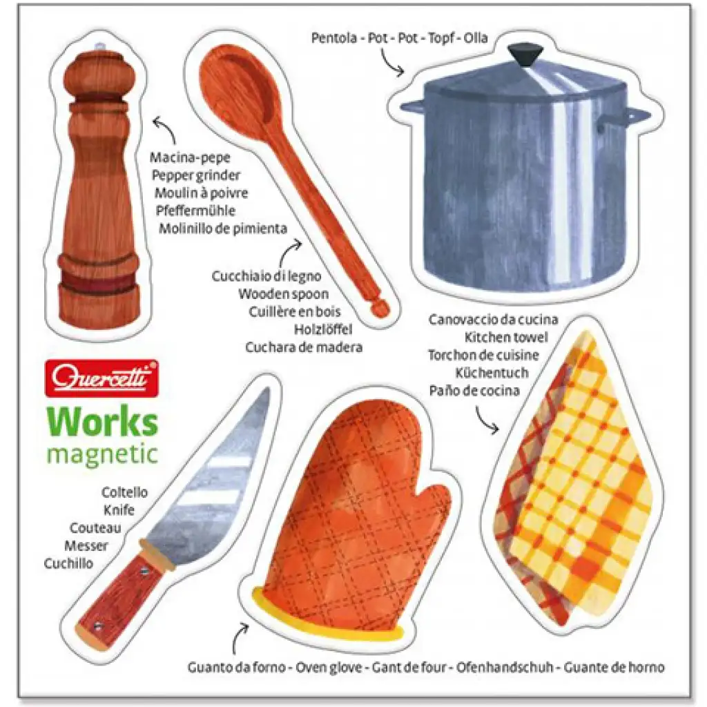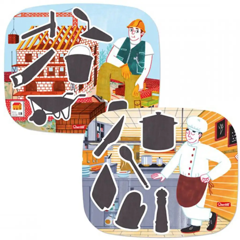 Ez a játék szórakoztató módon ismerteti meg a gyerekekkel a kőműves és szakács szakmák rejtelmeit, helyszíneit és kellékeit. Mindezekhez egy izgalmas mágneses megoldás használható, hiszen az építkezésen és a konyhában a megfelelő helyekre kell tenni a megfelelő dolgokat a kalapácstól a fazékig. A Quercetti Montessori sorozata azokat a kreatív és készségfejlesztő, oktatójátékokat tartalmazza, melyeket a híres tanító Maria Montessori munkái ihlettek, így olyan játékok és eszközök készülnek, amelyek valóban fejlesztő hatással vannak a gyerekek készségeire. A szett egy biológiailag lebomló csomagolásban érkezik.