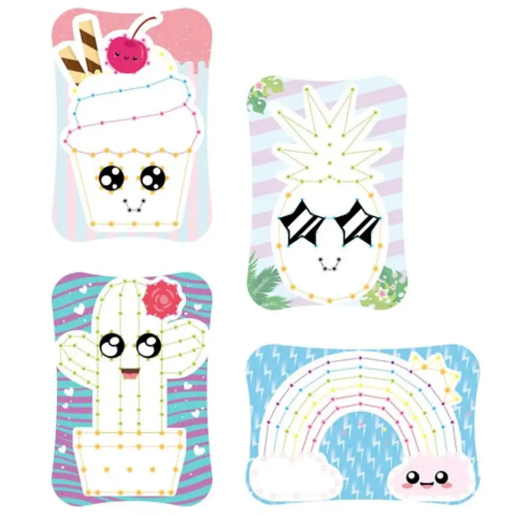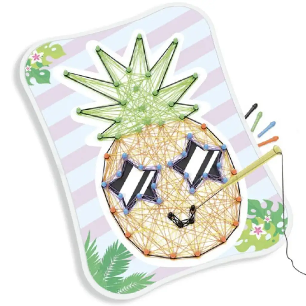 Ez a nagyszerű kreatív játék garantáltan vidám perceket szerez a mókás képeivel, amelyeket nem filctollakkal és ceruzákkal kell kiszínezni, hanem a rendelkezésre álló kilenc színes fonal szolgál erre a célra. A Play Creativo String Art készletek között a kicsik és a nagyok is megtalálják a nekik megfelelő kihívást. A választott képet a lyukacsos táblára helyezve, első körben a színes tüskéket kell elhelyezni, majd jöhet a színes fonal, amivel szinte ki lehet színezni az ábrát úgy, hogy az színes tüskék közé feszítjük az erre alkalmas vezető segítségével.