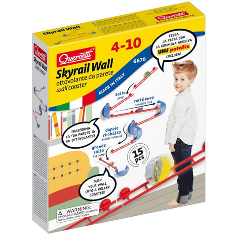 A Quercetti Skyrail golyópályáit aligha kell bárkinek is bemutatni, hiszen a több méter hosszú pályákon rendkívül izgalmas golyóversenyeket lehet lebonyolítani. Azonban ebben a csomagban olyan pálya lapul, amilyenhez foghatót eddig biztosan nem láttál. Ezt a pályát a függőleges falra kell felszerelni, és a golyók így egy nyomvályúban illetve a fordítók segítségével képes végig haladni a kiépített útvonalon. A készletben megtalálsz mindent, amire csak szükséged lehet a pályaelemektől kezdve a golyókon keresztül a ragasztóig, amellyel a pályát a falra rögzítheted.