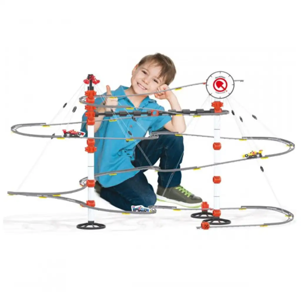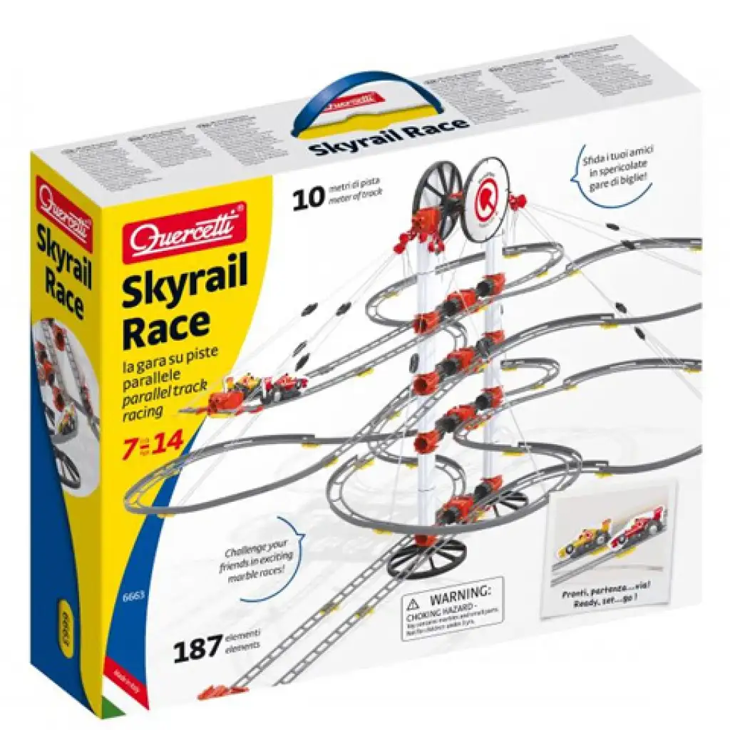 Vigyázz, kész...RAJT! Bemutatjuk az új Skyrail versenypályát. Ez a dupla versenypályás hullámvasút egyenesen a golyófutamokra lett tervezve. A két különálló pálya amit tartókötelek tartanak egyben arra lett kialakítva, hogy egyszerre két golyóval versenyezettek a barátaiddal. A tartókötelek nem csak arra lettek tervezve, hogy tartsák a pályát de segítségükkel akár meg is tudod változtatni az emelkedést, ezzel kedvedre változtatva a pályát. Ez a játék kitűnő lehetőséget biztosít a megfigyelésre, kísérletezésre és a felfedezésekre, hogy megértsd az alapvető elveit a fizikának mint például a gyorsulást, a gravitációt, a centrifugális erőt vagy a súrlódást. Mindezek összessége egy különleges oktató játékot hoz lépte mivel garantáltál a hosszú órákon át tartó biztonságos játékélmény.