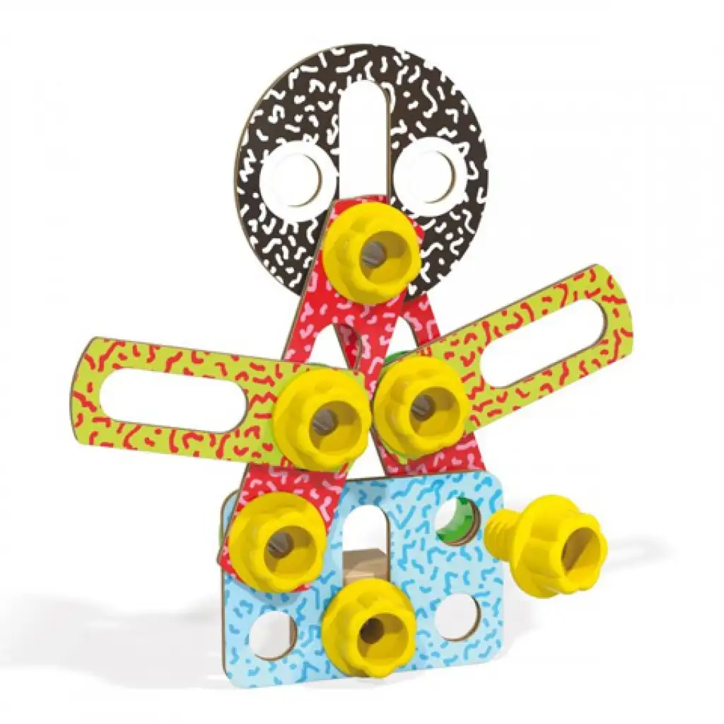 A kedvenc formáidat most több ezerféleképpen készítheted el ezzel a kemény és ütésálló műanyag csavar és alátét készlettel. Mindened megvan ahhoz - csak a kreativitásodat ne hagyd otthon -, hogy robotokat, vicces figurákat, struktúrákat, épületeket és minden mást amit csak akarsz megalkoss. Az eredeti fa és műanyag építős játék amit teljes nagyságban vibráló színek díszítenek stimulálják a gyerekek kézügyességi képességeiket és a gondolkodásukat. Mindemellett bevezetik őket a mechanika rejtelmeibe. Minden egyes játékelem Olaszország szakérői által készült nagy teljesítményi elvárásokkal és külön odafigyeléssel a biztonságra és a környezettudatosságra.