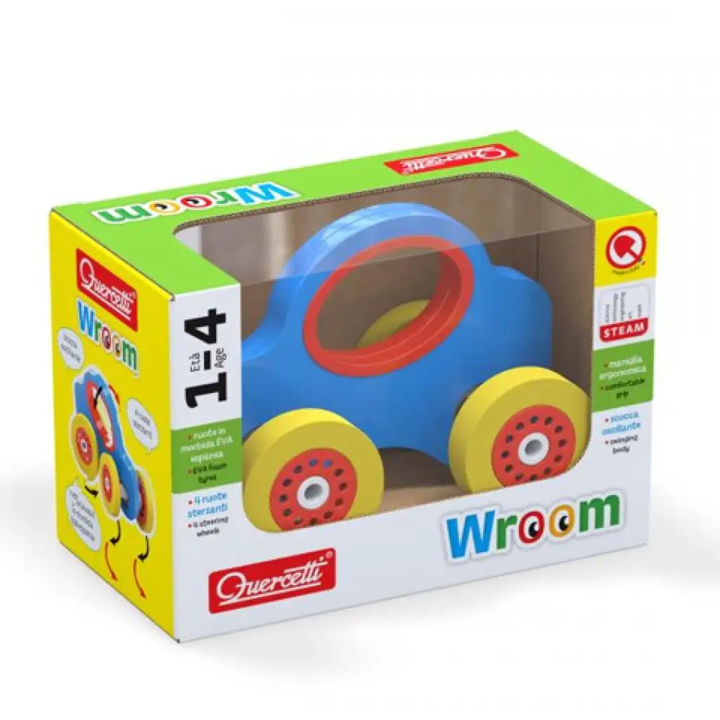 Ezzel a kiskocsival garantáltak az élménydús pillanatok hiszen a forgatható teste miatt nem csak előre és hátra hanem oldalirányúan is utazhatsz vele. A kerekek levehető EVA habszivacsból készültek amik kimoshatóak és bármilyen felületen . legyen szó kül- vagy beltérről - jól tapadnak. Nem rongálja a felületet amin gurul és nem ad ki semmilyen hangot sem. Minden egyes Wroom kiskocsi fel van szerelve a hátulján egy ovális alakú fogókával ami elősegíti a csukló megfelelő mozgását és a mozgáskoordináció fejlődését.