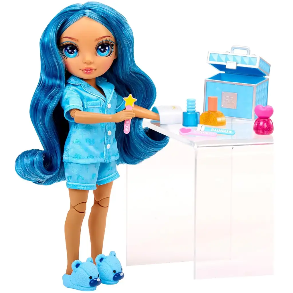 Skyler egy gyönyörű, kék árnyalatokban pompázó baba, aki jellegzetes hosszú, hullámos kék hajával és ragyogó kék szemével azonnal elvarázsolja a gyerekeket. Pizsamája egy trendi, rövidnadrágos szett, amelyen apró Rainbow High logók díszelegnek, így igazán egyedi megjelenést kölcsönöz neki. A hozzá tartozó bolyhos papucs és a divatos kiegészítők még hangulatosabbá teszik az esti alvós bulit.