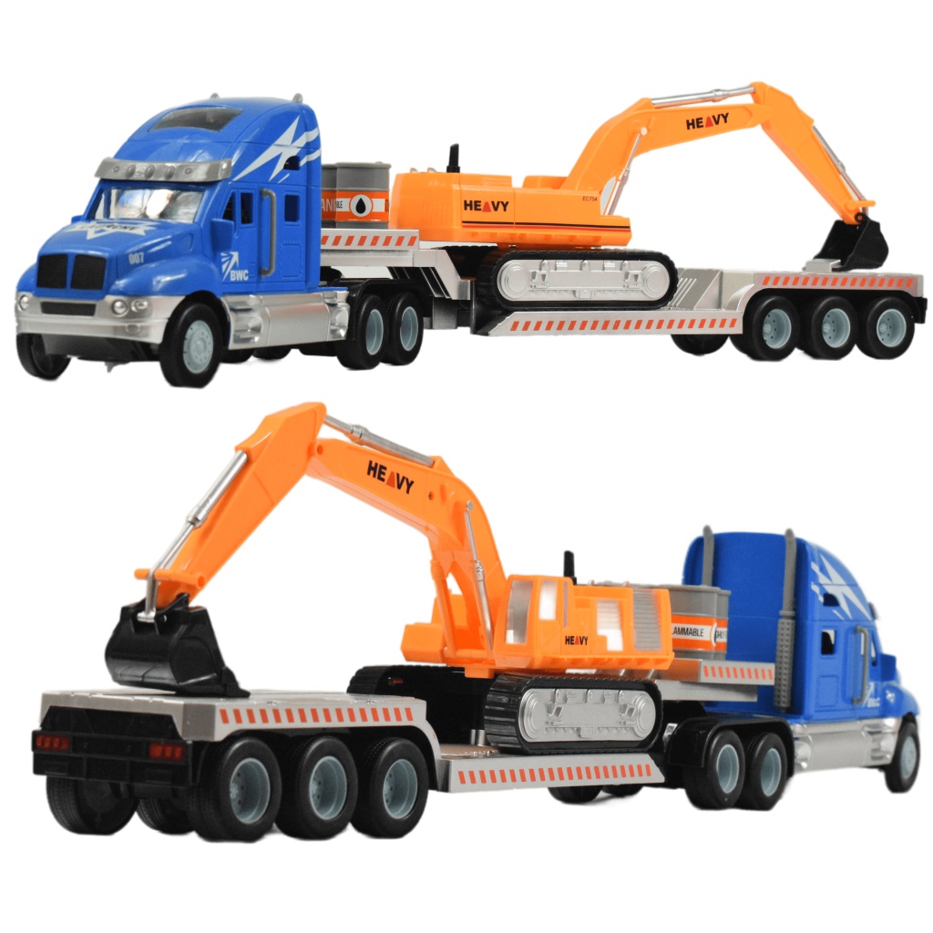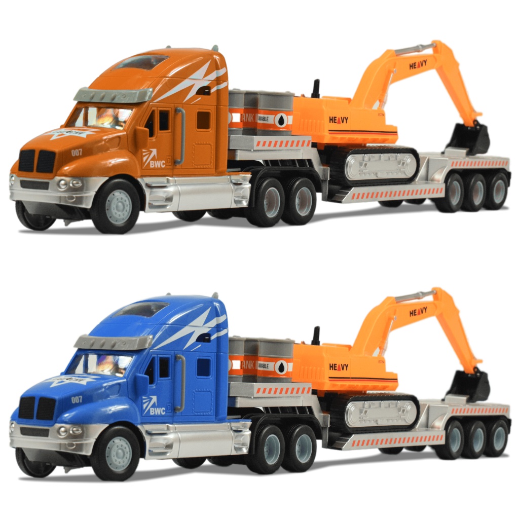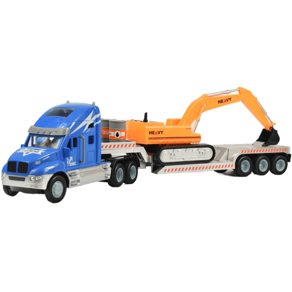 Az amerikai csőröskamionok rendkívül sokoldalúak, és számos iparágban használatosak. Rendkívüli erejük miatt az olyan hatalmas terhek megmozgatására is könnyedén képesek, mint egy építkezéseken használt munkagép. Ez a kamion is egy óriási exkavátort szállít, valamint 3db olajos hordót. Ez a fantasztikus távirányítós csőrös kamion megszólalásig hasonlít az igazi amerikai teherkocsikra, köszönhetően részletgazdag, élethű kidolgozásának. Az 55cm hosszú, két kerék meghajtású szerelvény a 2.4GHz-es távirányítóval minden irányba vezérelhető. A kamion működtetéséhez szükséges 4.8V-os 300mAh-s akkumulátor és az USB töltő megtalálható a csomagban, a távirányítóba való 2db 1.5V-os AA elemek külön kaphatóak.