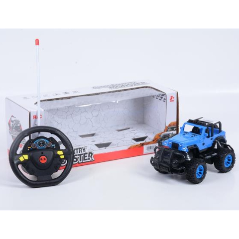 Egy igazán különleges távirányítós autóval száguldozhat gyermekünk vagy akár mi magunk is, ha ezt a kék Jeep Wrangler karosszériával ellátott modellt válasszuk, mely ezúttal monster kivitelben gurul majd hozzánk. A kocsi hatalmas kerekeinek köszönhetően könnyedén átgördül majd mindenen. Az autó különlegessége, hogy kormány alakú távirányítóval rendelkezik, melyről gombok segítségével vezérelhető az autót. A kocsi előre-hátra és jobbra-balra tud menni. A működtetéshez szükséges elemeket a szett nem tartalmazza.