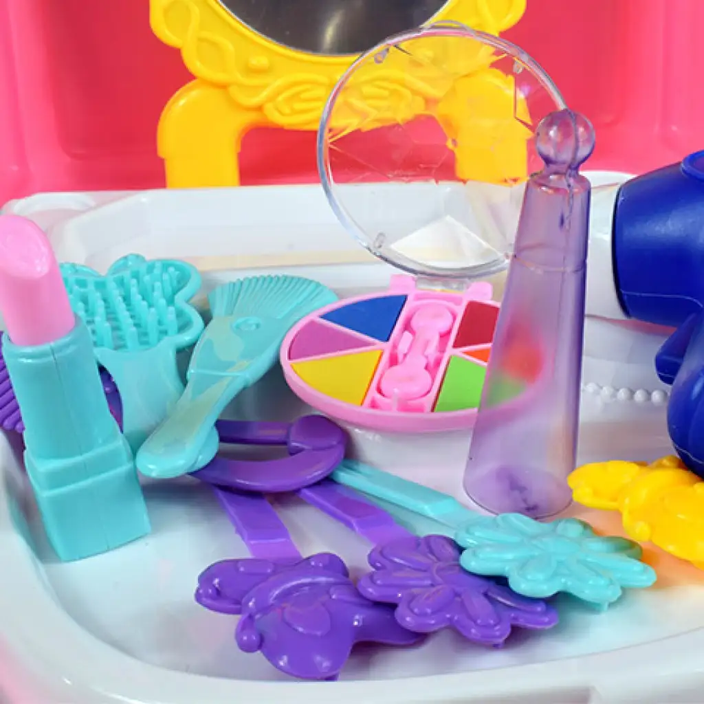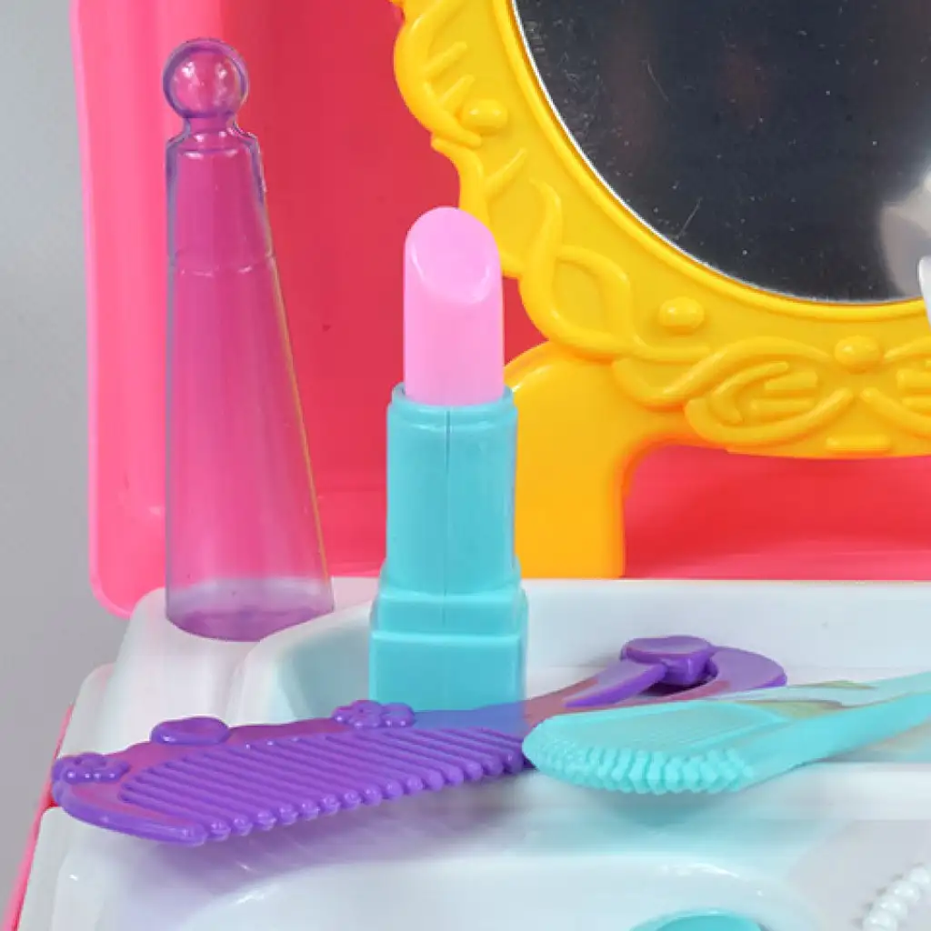 Egy nagyon csajos és praktikus szépség szettel lepheted meg gyermekedet, amit bárhova magával vihet majd. A szett ugyanis egy műanyag hátizsákban érkezik, ami állítható vállpántokkal lett ellátva, így kényelmesen tudja majd hordozni magával. belsejében egy asztalként szolgáló fehér lap, illetve egy sárga, díszes tükör is található, ami a hátlapjára akasztható fel. Persze a sminkek sem maradhattak ki, így a szettben rúzs, sminkpaletta ( szivacs sminkkel), hajcsatok, fésű, és egy nagy ecset is található, persze mind játék, így funkciójukat nem töltik be, viszont gyermeked remekül szórakozhat majd vele, hiszen kreativitásának köszönhetően igazi hercegnőnek érezheti majd magát a játék közben. Persze a hajszárító és egy üvegcse parfüm sem maradhatott ki a szettből. Szerezd be számára és kezdődhet is a játék, amiben bárhol és bármikor része lehet majd.