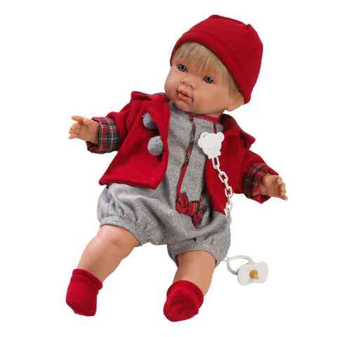 Megállapítható, hogy minden kisbabáknak jól áll a piros szín. Ezt példázza ezt példázza ennek a kedves arcú babának a ruházata is, hiszen sapkája, zoknija és kapucnis felsője is egyszínű piros. A rugdalózó báját emeli a kockás anyagból készült masni felvarró, melynek mintázata megegyezik a kapucnis felső kézelőjén lévő mintázattal. A baba műanyag részei puha, gyermekbarát anyagból készültek, teste pedig textilből. A tesben van elhelyezve a szerkezet az elemekkel, melyek képessé teszik a babát a síró hang kiadásra. A baba a sírást akkor hagyja abba, ha a cumit a szájába helyezzük.