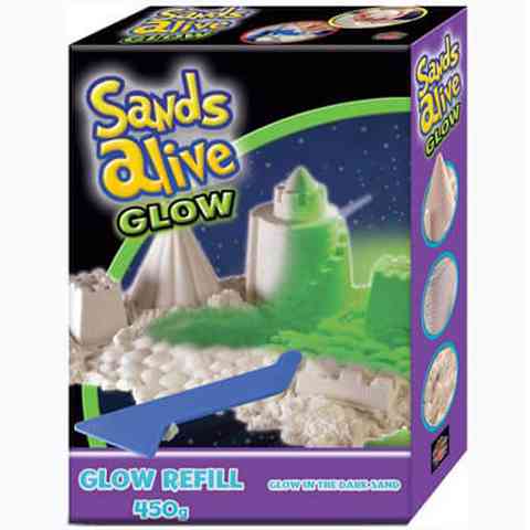 A Sands Alive homokgyurma különleges képessége az, hogy fénnyel feltöltve világít a sötétben. A forradalmian új technológiának köszönhetően ultra puha tapintású és kiszáradásmentesen dolgozhatsz vele. A játék végeztével könnyedén összeszedheted a darabkákat, a gyurma nem morzsolódik. A 450g-os utántöltővel pótolhatod a már meglévő Sands Alive készleted gyurmáját és segítségével mégnagyobb építményeket alkothatsz meg. A csomagban a világító gyurma mellett egy formázó eszközt is találhatsz, amellyel azonnal megkezdheted az alkotást.