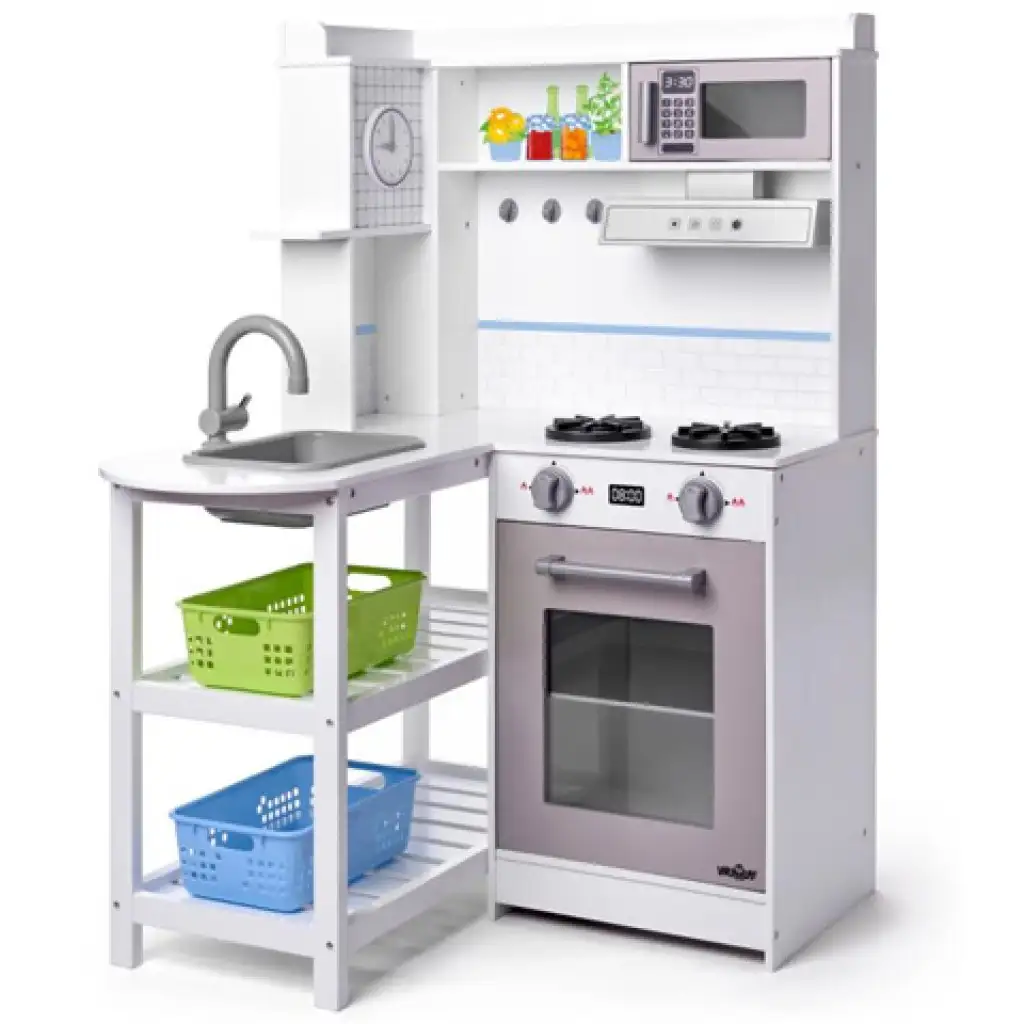 A gyerekek szeretnek minden olyan dolgot lemásolni, amit a szülők is csinálnak, így örömmel tevékenykednek a konyhában is. Ebben a készletben egy szuper sarok konyha szett található, amiben mindent megtalálnak a kicsik, ami remek játékra ad lehetőséget. A konyharészlet nagy részét egy sütő és gáztűzhely teszi ki ami felett egy páraelszívó és egy mikrohullámú sütő is helyet kapott. A készlet másik részét a mosogatópult adja, ami alatt két polc kínál helyet a műanyag kosarak számára.