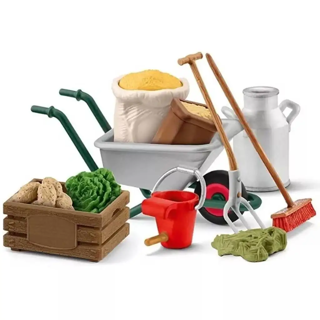A szett tartalmaz egy strapabíró talicskát, amelybe gabonazsákok és szénászsákok helyezhetők, így a gyerekek eljátszhatják az állatok etetésének folyamatát. Az állatok friss takarmányáról egy zöldséges láda gondoskodik, amelyben burgonya és saláta található. A farm mindennapi gondozásához szükség van egy seprűre és egy vasvillára, amelyeket a készletben szintén megtalálsz. Ezekkel az eszközökkel a gyerekek eljátszhatják, hogyan tisztítják ki az istállót és biztosítanak tiszta, kényelmes környezetet az állatok számára.