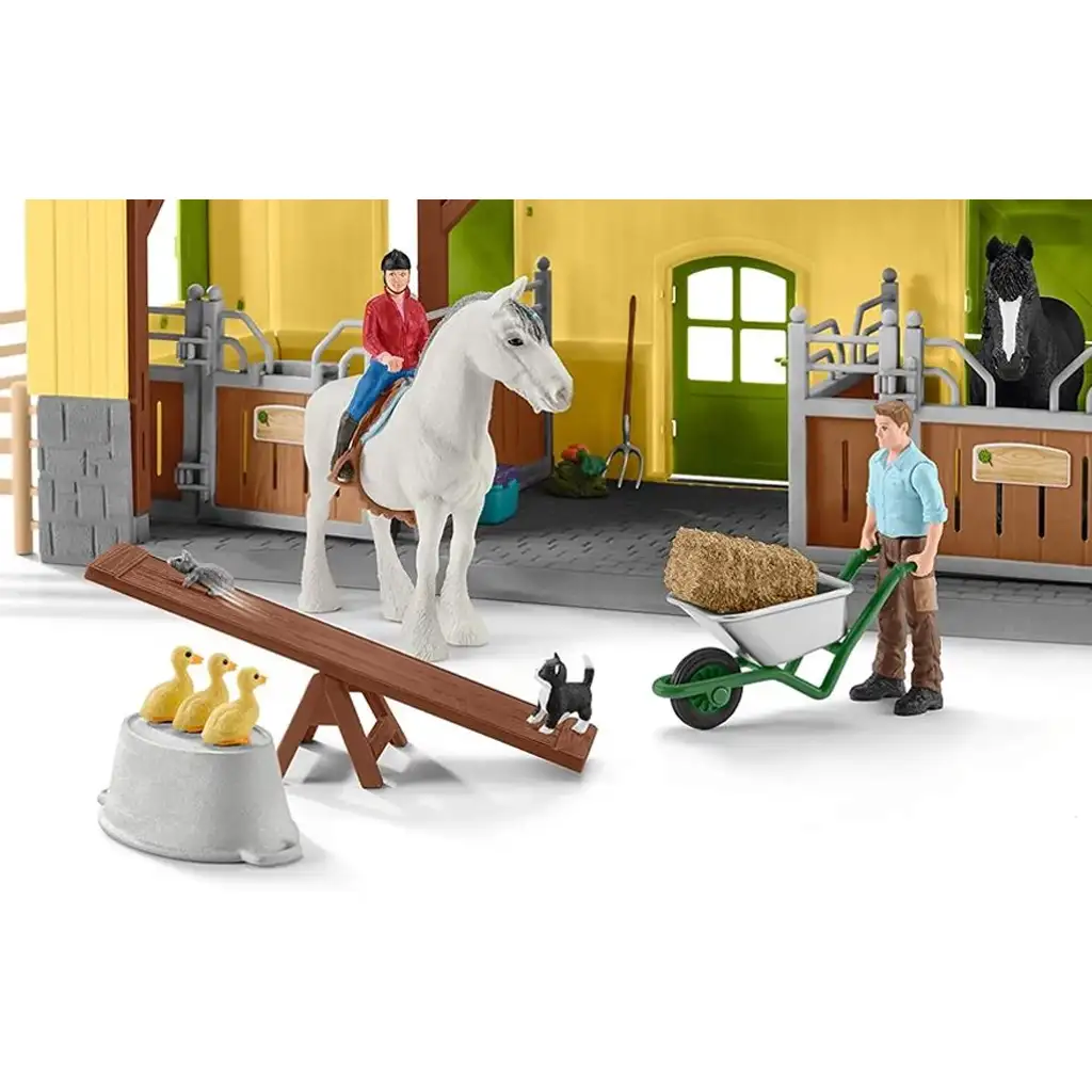 A készlethez tartozik egy farmerfigura, akivel a gyerekek eljátszhatják a napi teendőket, például a lovak etetését, ápolását vagy akár az istálló kitakarítását. A talicskával könnyedén lehet szállítani a szalmabálákat, míg a mérleghinta és az apró állatok további játékos elemeket adnak a farm mindennapi életéhez.