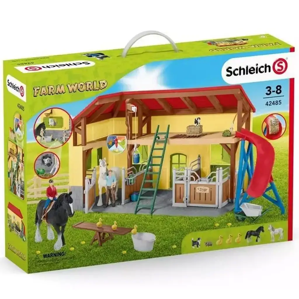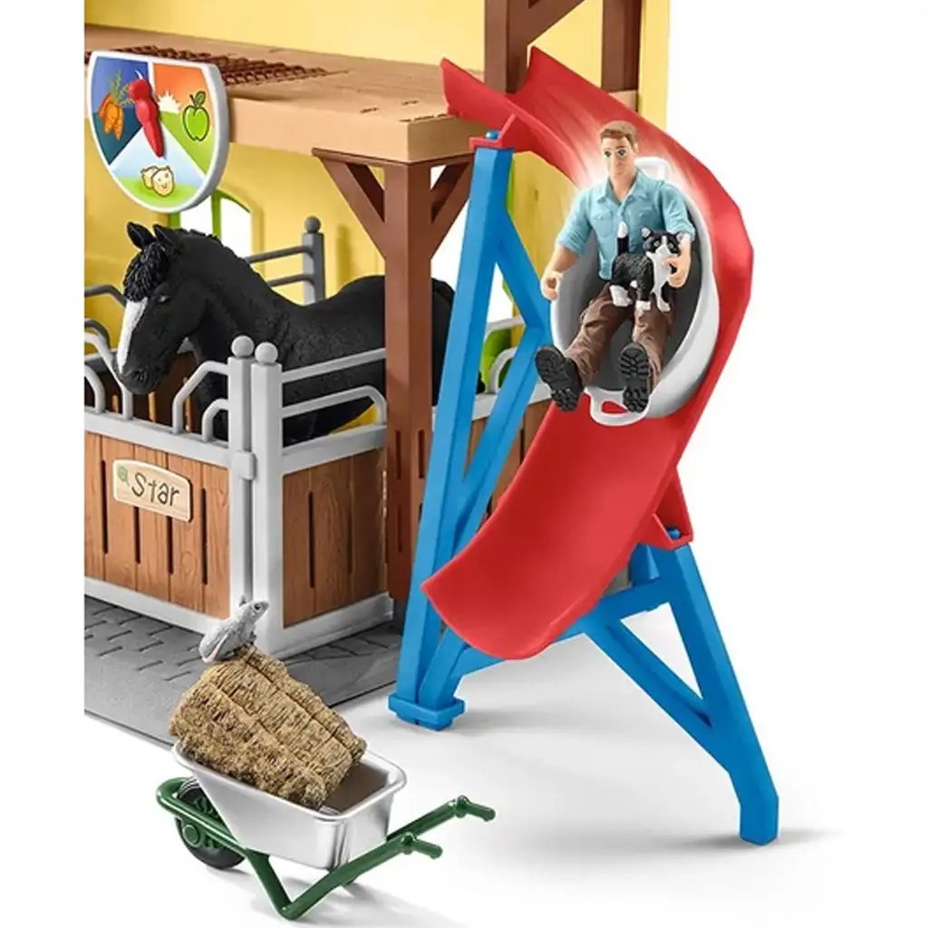 Az istálló egyik különlegessége a piros csúszda, amely még játékosabbá teszi az élményt – a gazda akár a padlásról is lecsúszhat, hogy gyorsabban elérje az állatokat! A padláson takarmánytároló és kis állatok, például kiscicák és kacsák is megtalálhatók, így a farm igazán élettel teli. A lovak bokszai tágasak, egyedi névtáblával ellátottak, és nyitható ajtóval rendelkeznek, így a gyerekek könnyedén ki- és bevezethetik kedvenc paripáikat.