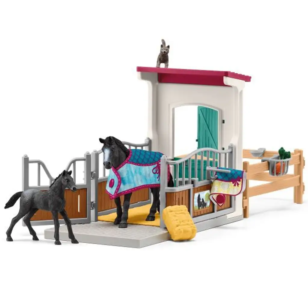 Az istálló nyitható ajtókkal és egy elkerített kifutóval rendelkezik, így a lovak szabadon mozoghatnak. Az istálló falán egy cuki ló portré és egy névtábla található, így teljesen testreszabható a készlet. A kancának egy színes, meleg lótakarója is van, amely megvédi a hidegtől, míg a csikó vidáman ugrándozhat a karámban.