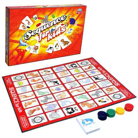 A játék lényege: A kártyacsomag a táblán látható állatok képét tartalmazza, melyből mindenkinek 3-at kiosztunk, majd a lerakott kártyák helyett minden alkalommal újat húzunk. A korongokat a lerakott kártyának megfelelő ábrára helyezzük el a táblán. Olyan ügyesen kell a táblára a korongokat kirakni, hogy vízszintesen, függőlegesen vagy átlósan 4-es sorozatot alkossunk. Eközben azt is figyelnünk kell, hogy társunk és ellenfelünk hova helyezi korongjait. A győztes, aki először rak ki egy sorozatot . A SEQUENCE játékok azért olyan sikeresek a világ minden pontján, mert fejlesztik a gyerekek forma és színmegfigyelő képességeit, valamint egy nagyon élvezetes és szórakoztató játék közben magas fokra fejleszti a gyermekek logikai készségeit.