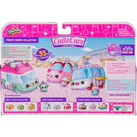 Megérkeztek a Shopkins szuper járgányai, a cuki kocsik. A Freezy Riders szettben háromféle színes, vidám mosollyal ellátott kocsit találsz, melyekben pont elfér egy mini Shopkins. Nyisd ki a kocsik ajtaját, ültesd be a kosárlakókat, és szállítsd el őket, ahová csak akarják. A cuki kocsik mindegyike egy ínycsiklandó fagylalt és aranyos állatka kombinációjából született, így a vidámság garantált. Szerezd be mindegyik típust és a cuki kocsi játékszettet is, mely hatalmas parkolóval és lifttel teszi élvezetessé a játékélményt.