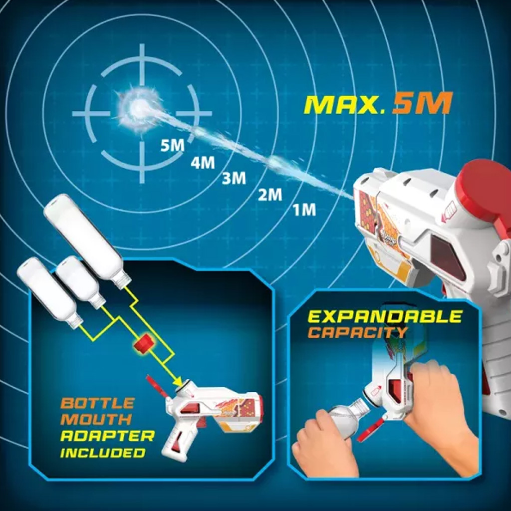 Az elektromos működésnek köszönhetően nem szükséges pumpálni: egy gombnyomással folyamatos vízsugarat lő, ami gyorsabbá és élvezetesebbé teszi a játékot. A beépített fényhatások még izgalmasabbá varázsolják a használatát, különösen árnyékosabb környezetben vagy esti játék során. A pisztoly akár 5 méteres hatótávval rendelkezik, így könnyedén elérhetők a „célpontok”.