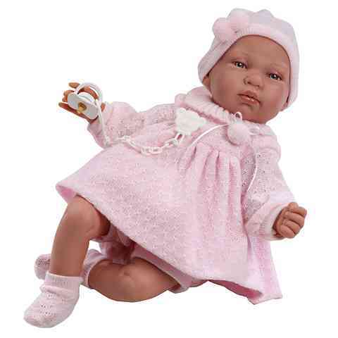 Ezt a tündéri kislány babát vásárolhatod meg gyermeked számára, aki garantáltan megszereti őt már az első pillanattól kezdve. Hiszen játszhat vele, dajkálhatja és még öltöztetheti is. Ezen kívül pedig nem akármilyen funkcióval is büszkélkedhet ez a nagyszerű baba: bekapcsolt állapotban a papa és a mama szavak kimondására, illetve síró hang kiadására is képes, melyet azonnal abbahagy, ha a szájába helyezzük a cumiját. Teste puha textilből, míg arca, kezei lábai kellemes tapintású műanyagból készültek. Édes kis kötött ruhácskát adtak rá, ami alatt egy rövidnadrág is található, sőt a csomagba sapit és zoknit is helyzetünk, így lesz teljes a ruhatára.