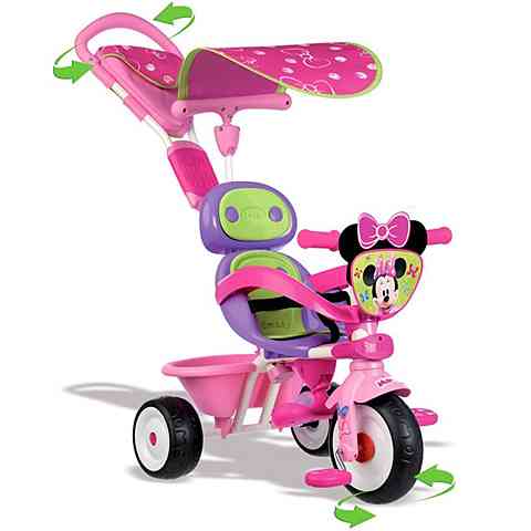 Teljes kényelemben utazhatnak a gyerekek ezzel a Minnie egeres 3 az 1-ben triciklivel, hiszen még napellenzővel is fel van szerelve! A biztonsági övvel ellátott ülésbe becsatolhatják a szülők a gyermeket, majd a tolókar segítségével irányíthatják, kormányozhatják a triciklit. A gyermek növekedésével átalakítható a tricikli, majd végül a nagyobbak már a klasszikus tricikli járgányt használhatják.
