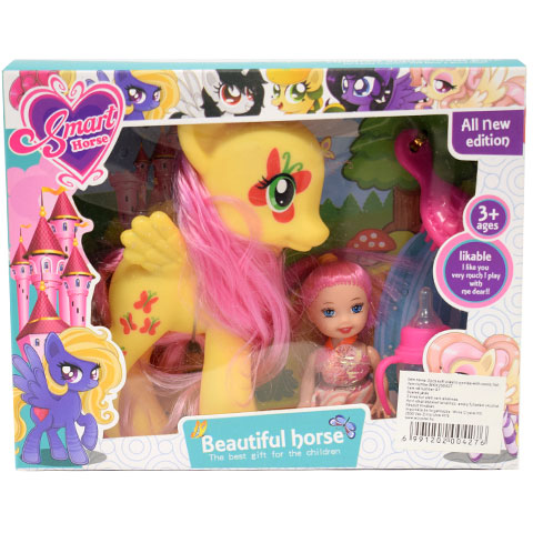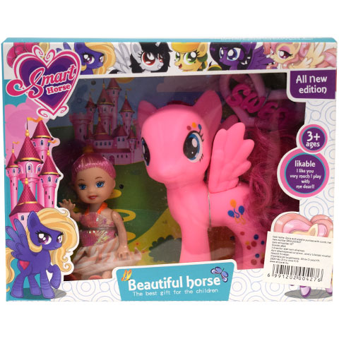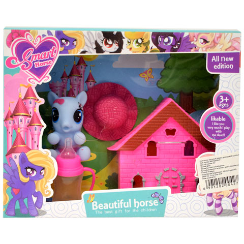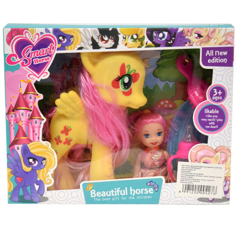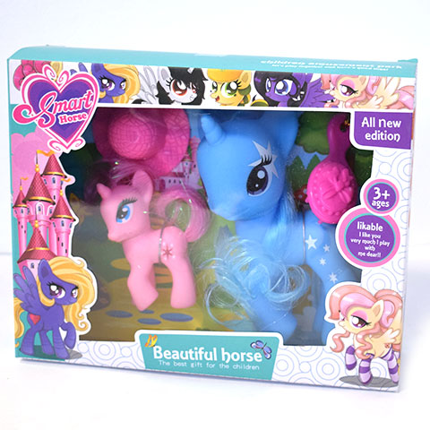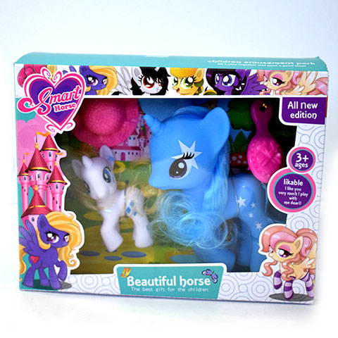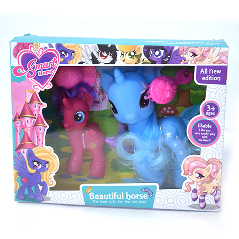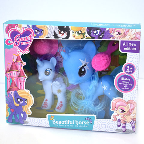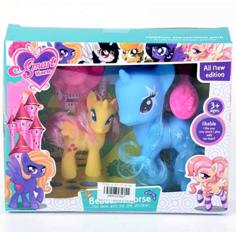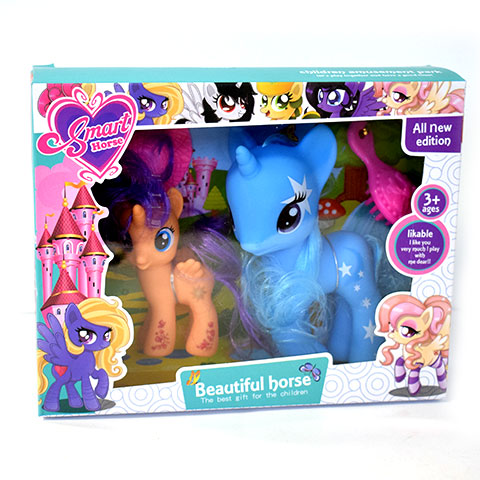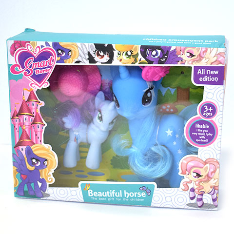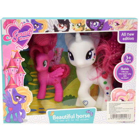 A készletben két nagyon aranyos póni található. Mindkettő nagyon szép hosszú és színes sörényével nagyszerű játékélményt kínál a kislányok számára akik imádják ezeket a varázslatos jószágokat, ami nem is csoda, hiszen az Én kicsi pónim mesefilm hősei éveken keresztül lopták bele a lányok szívében. A kis pónik természetesen nem tartalmaznak semmilyen káros anyagot, így a kislányok szabadon és önfeledten játszhatnak vele, miközben felelevenítik a mesék legjobb részeit.