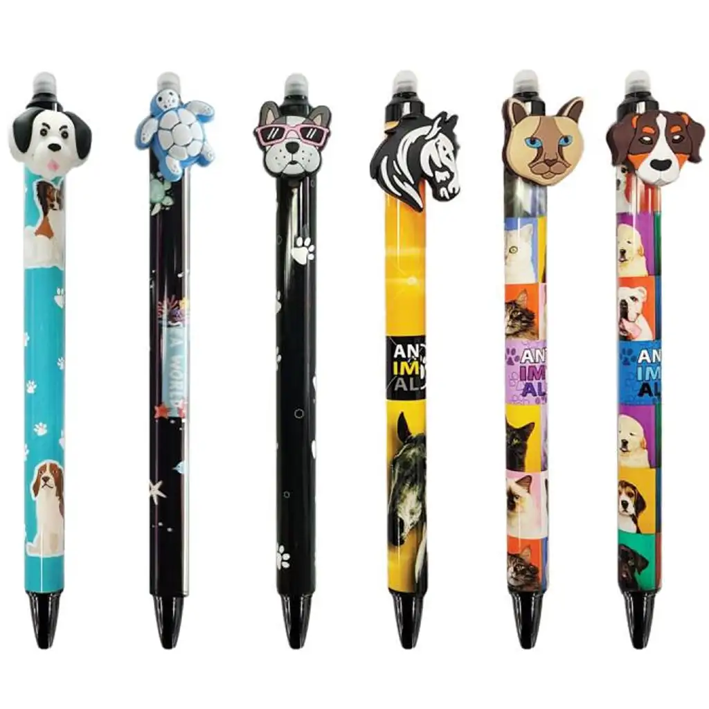 Ez a radírozható zselés toll tökéletes társ minden iskolai kalandhoz vagy otthoni íróasztalhoz, különösen az állatbarát gyerekeknek! Hatféle vidám és színes állatos minta közül egyet szállítunk véletlenszerűen – lehet cuki kutyus, menő teknős, napszemüveges bulldog, zebra, macska vagy más kis kedvenc, így a toll nemcsak hasznos, de szórakoztató is. Minden egyes toll tetején egy puha, figurás radírral találkozhatsz, ami még különlegesebbé teszi a megjelenést.