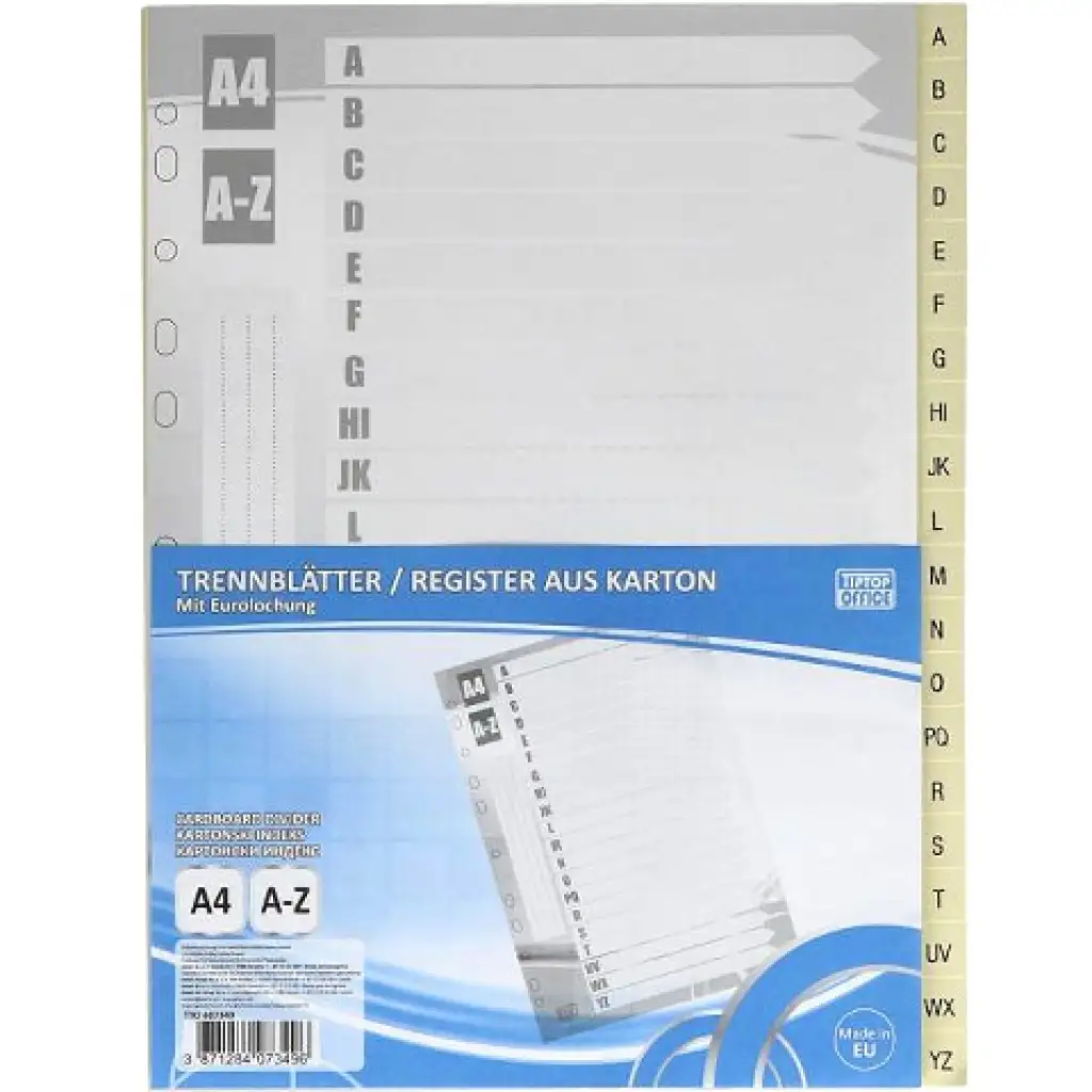 Különböző témaköröket választhatnak el a gyűrűs mappában kicsik és nagyok ezekkel az elválasztó lapokkal, melyeknek fülein az angol ábécé betűi láthatóak. A betűkkel jelölt fülekkel rendelkező elválasztólapokhoz tartozik egy első oldalként használható tartalomjegyzék lap is, melyen feljegyezhetőek a betűkhöz tartozó témakörök. a lapok 11 lyukas kialakításúak, így bármely mappában könnyen lefűzhetőek.