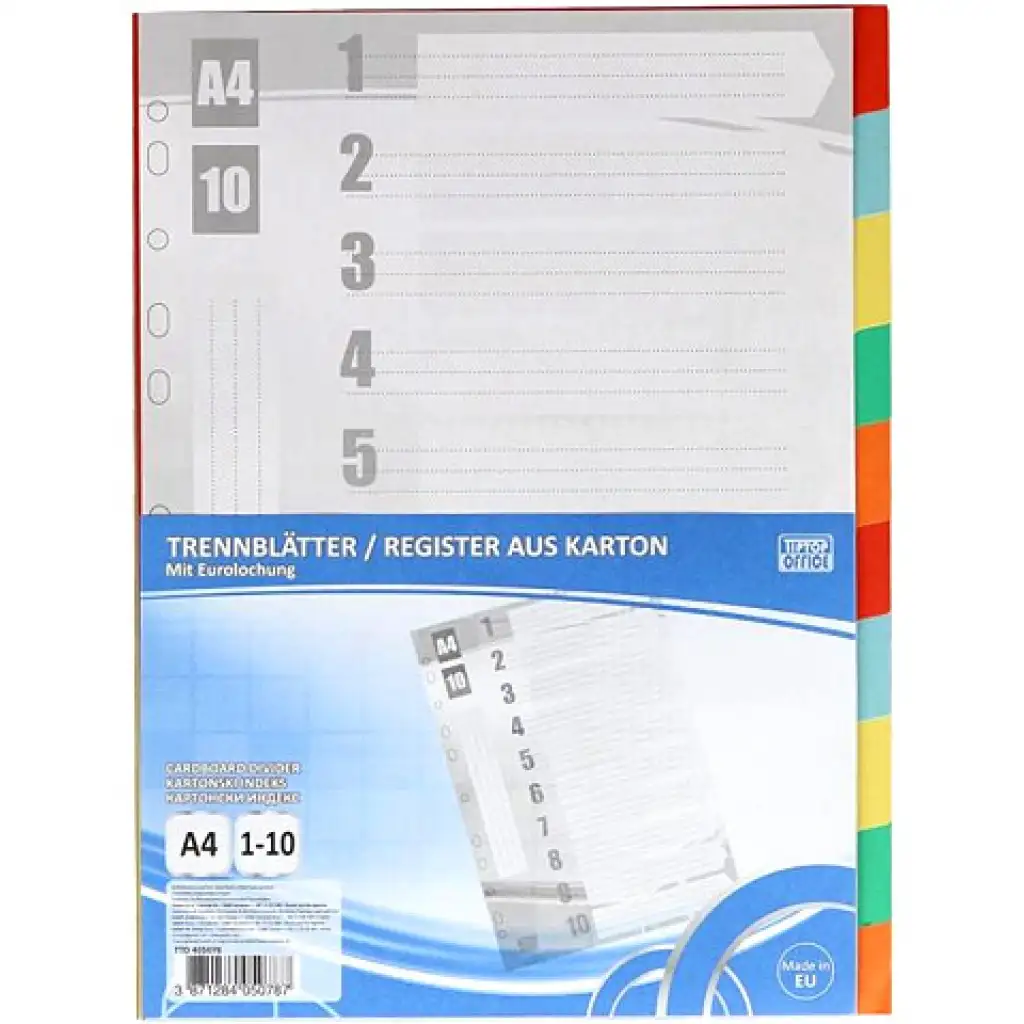 Gyűrűs mappákhoz tökéletes kiegészítés ez a fehér lapokat tartalmazó elválasztó szett, melynek része összesen 10 oldal, színes index-szel, valamint egy tartalomjegyzék oldal. Az A/4-es méretű elválasztó lapok tökéletesen lefűzhetők, hiszen 11-luykas kialakításuknak köszönhetően éppen ott illeszkednek a mappába ahol kell. A színes elválasztólapokkal jól elkülöníthetőek a témakörök a mappán belül, így átláthatóbb, rendezettebb lesz annak tartalma.