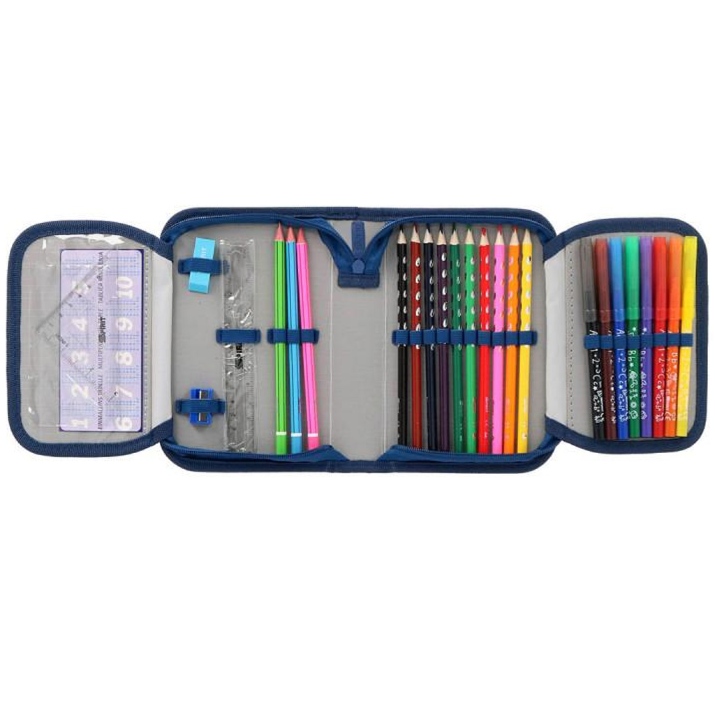 A tolltartó belseje átgondolt kialakítású, több kihajtható füllel és gumipántokkal, így minden eszköznek megvan a helye. A 28 darabos készlet tartalmaz 3 grafitceruzát, 10 darab színes ceruzát, 8 filctollat, radírt, hegyezőt, vonalzót és háromszög vonalzót, valamint órarendet és névtáblát is, így a gyermeked teljesen felkészülten indulhat az iskolába. Minden könnyen átlátható és gyorsan elérhető.