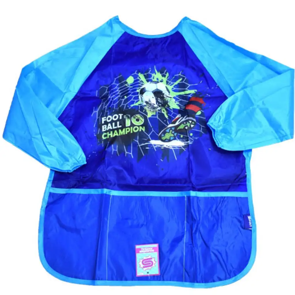 A gyerekek tetszését biztosan elnyeri majd ez a különleges focis köpeny, mely munka közben megvédi a ruhájukat a nemkívánatos szennyeződésektől. A kötény anyaga strapabíró és vízlepergető. Tépőzárral könnyedén rögzíthető a gyerekeken és egyszerűen levehető. Az ujjakat gumiszalag fogja össze a gyerekek csuklóján. A hosszú ujjaknak és az elülső zsebeknek köszönhetően praktikus és még festőkellékek is tárolhatóak benne. A mérete úgy lett kialakítva, hogy 6-9 éves gyerekeknek ideális.