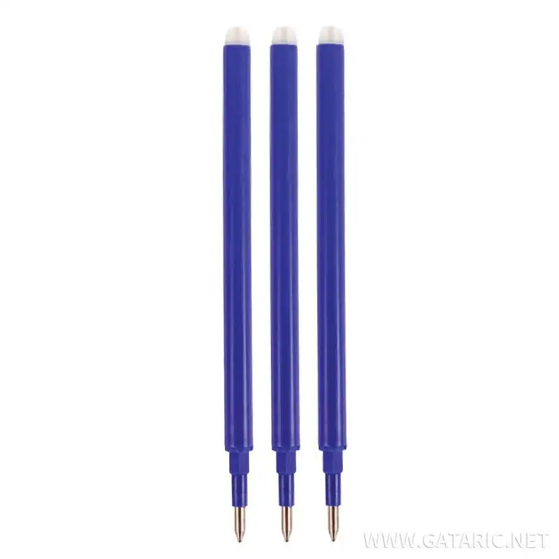 A zselés tollak rendkívül kényelmes írást és nagyon szép vonalvezetést eredményeznek, ráadásul ebben a csomagban található három betét olyan zseléanyagot kapott, ami a megfelelő radírral könnyen eltüntethető. A csomag három darab tollbetétet tartalmaz, amelynek a műanyag tartályában 0,7 gramm kék színű zselé kapott helyet. A kiváló minőségnek köszönhetően, a tollbetét igazán vékony vonalvastagságot eredményez, amit mintegy kétszáz méternyi vonalhosszon keresztül használhatunk.