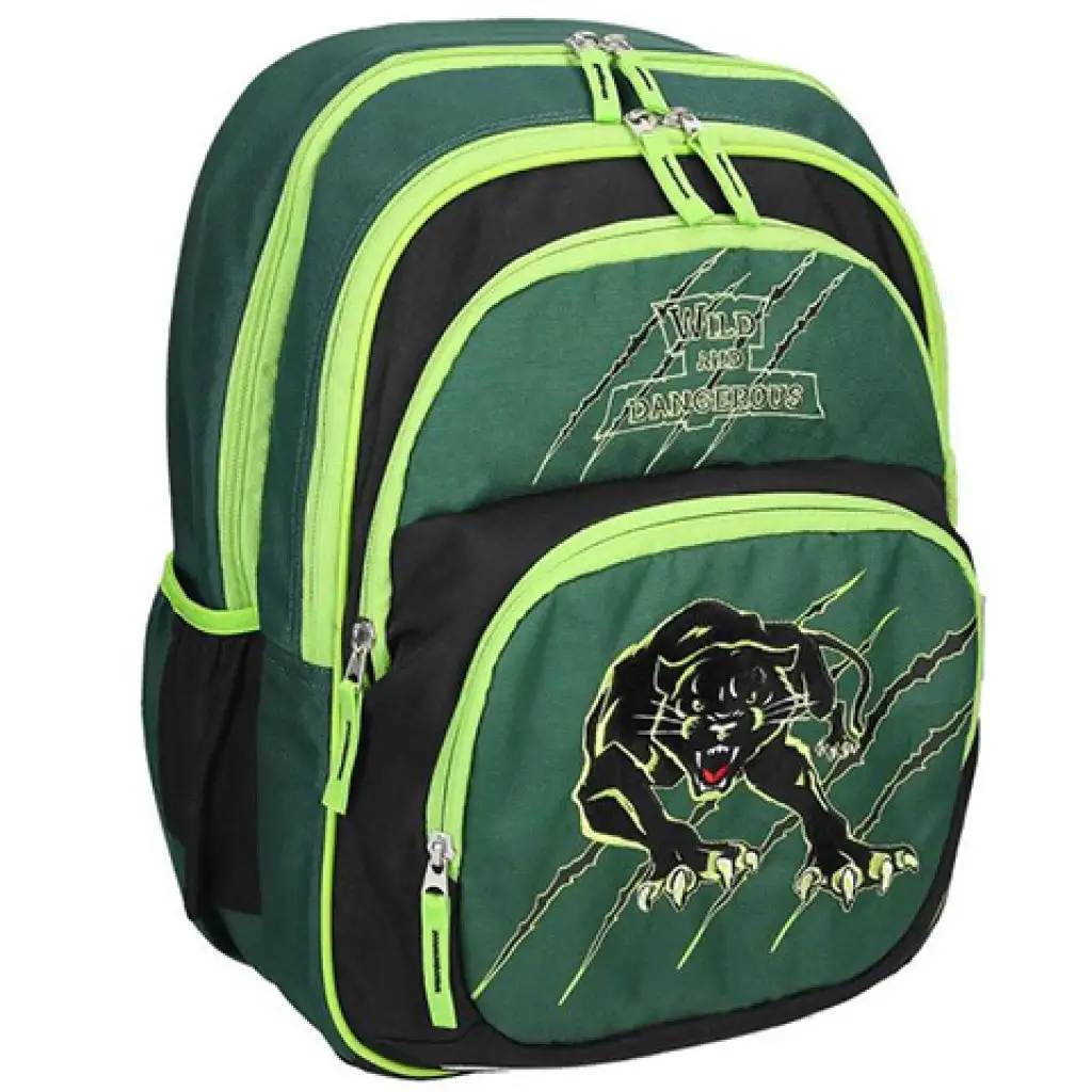 A vadon élő állatok közül ezúttal egy fekete párduccal találkozhat gyermeked a kiváló minőségű Spirit iskolatáskán amely zöld színe és menő mintázata divatos megjelenést kölcsönözhet neki az iskolai mindennapok során. A stílus mellett a kényelem is nagyon fontos szempont egy táska kiválasztásánál, a Spirit márka kiemelkedően odafigyelt az ergonómikus hátkiképzésre amelynek köszönhetően egyenes gerinctartással hordhatja gyermeked a táskát a mindennapokban. Párnázott és állítható vállpántja segítségével saját méretére állítható, így a lehető legkényelmesebb viseletet biztosíthatja. A táska nagyobb rekesze leginkább a tankönyveknek lett kialakítva, a kisebb zsebben a tolltartót, pénztárcát és egyéb apróbb használati tárgyakat tárolhatja gyermeked megelőzve ezzel a gyűrődések kialakulását. Kétoldalt kulacstartó található amelyben a fél literes kulacs gond nélkül elférhet.