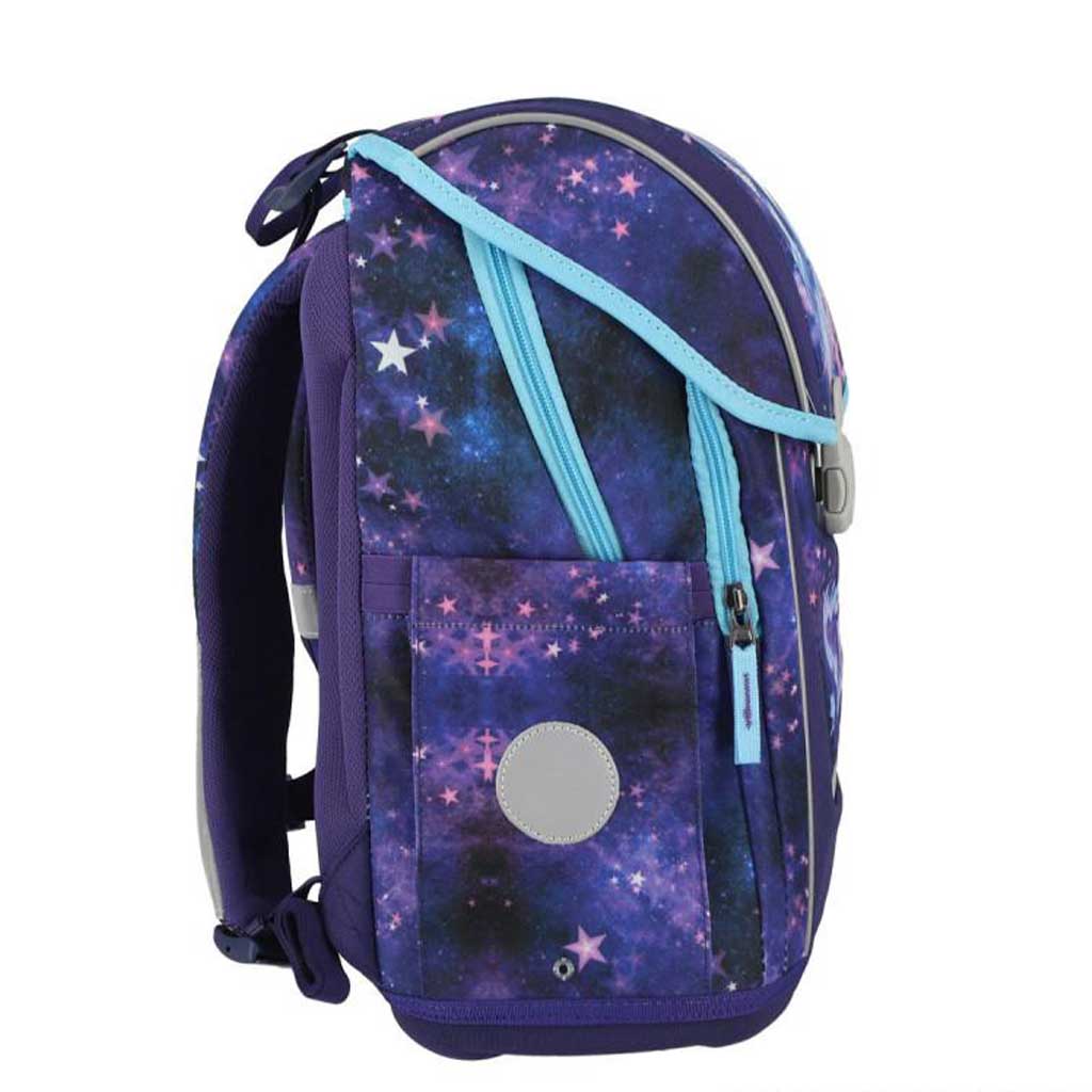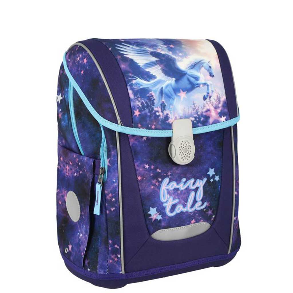 Ez a varázslatos pegazus mintás mágneszáras iskolatáska tökéletes választás, ha gyermeked szereti a mesebeli világot és az álomszerű, különleges mintákat. A táska elején egy gyönyörű, szárnyaló pegazus látható csillagokkal teli, galaktikus háttér előtt, amely igazán egyedi és elragadó megjelenést kölcsönöz. A lila és kék árnyalatok harmonikus kombinációja nyugodt, mégis figyelemfelkeltő stílust teremt, amit minden kisdiák örömmel visel majd.