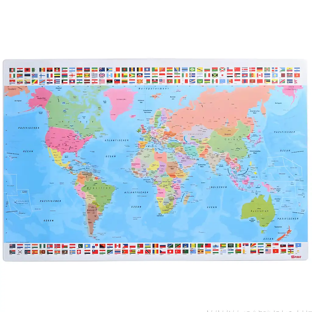 Terepeld be az íróasztalod a világ minden szegletéből származó inspirációval a Világtérkép asztali könyöklővel! Ez a PVC asztali kiegészítő nem csak egy könyöklő, hanem egy valódi utazás a világ körül. A világtérkép mintával és az országok zászlóival díszített, lekerekített sarkú könyöklő nem csak esztétikailag vonzó, hanem funkcionálisan is megállja a helyét.